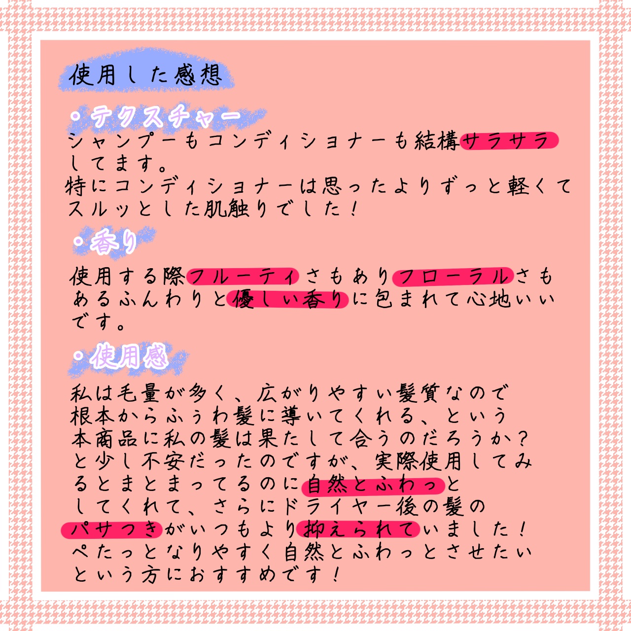 シャンプーはとろんとしたテクスチャー トリートメントはなめらかでふわっとやわらかいテクスチャー 泡立ちや泡切れがとっても良く キシむことなくしっとり根本からふんわりと軽い仕上がりに ほんのりと優しく華やかな香りの持続力も良かったです