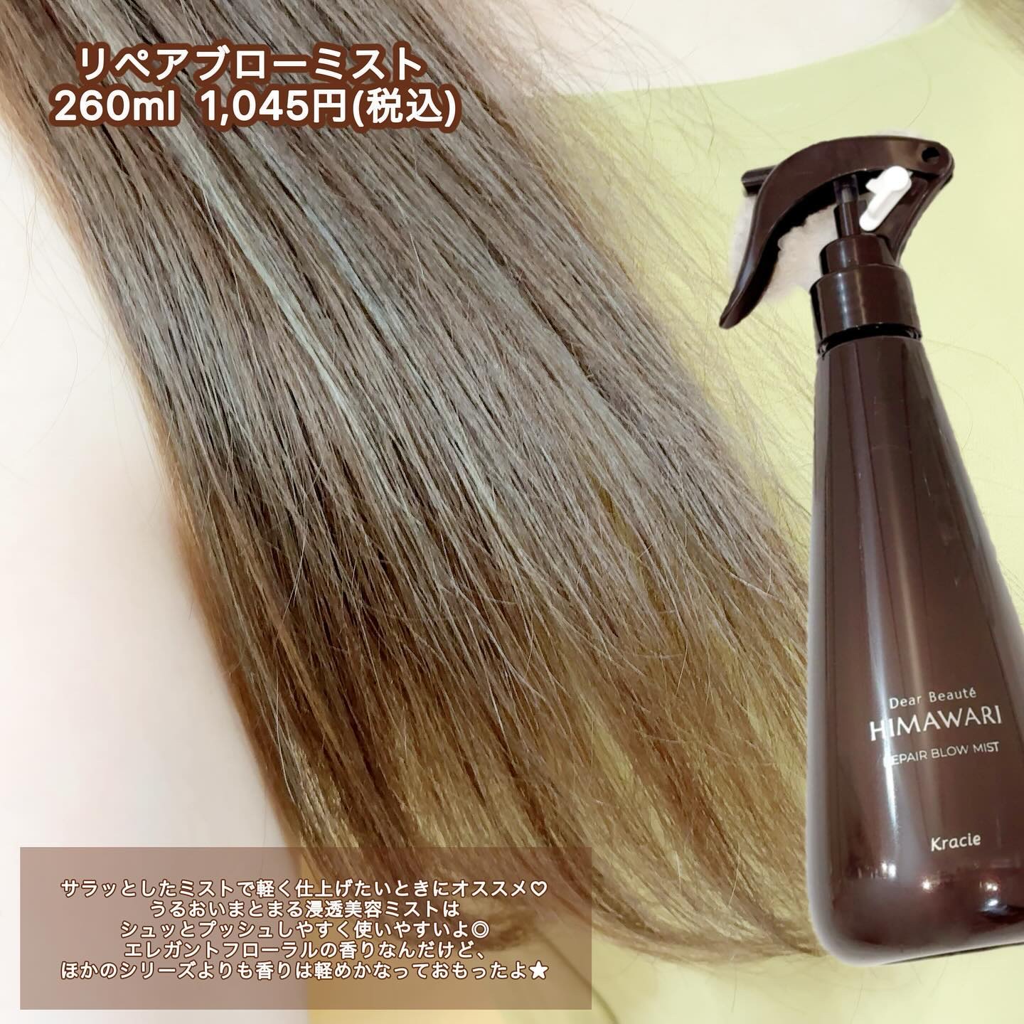 うねりやくせ、パサつきが気になる人におすすめで華やかなフローラルの香りがたまらなく好き💐 ミストやミルク、オイルなどを使い分けて自分の髪に合ったアイテムを選んでみてね🫧 ディアボーテ HIMAWARI*のリペアブローミスト、トリートメントリペアミルク、プレミアムリペアオイル(スムース)、プレミアムリペアオイル(モイスト)