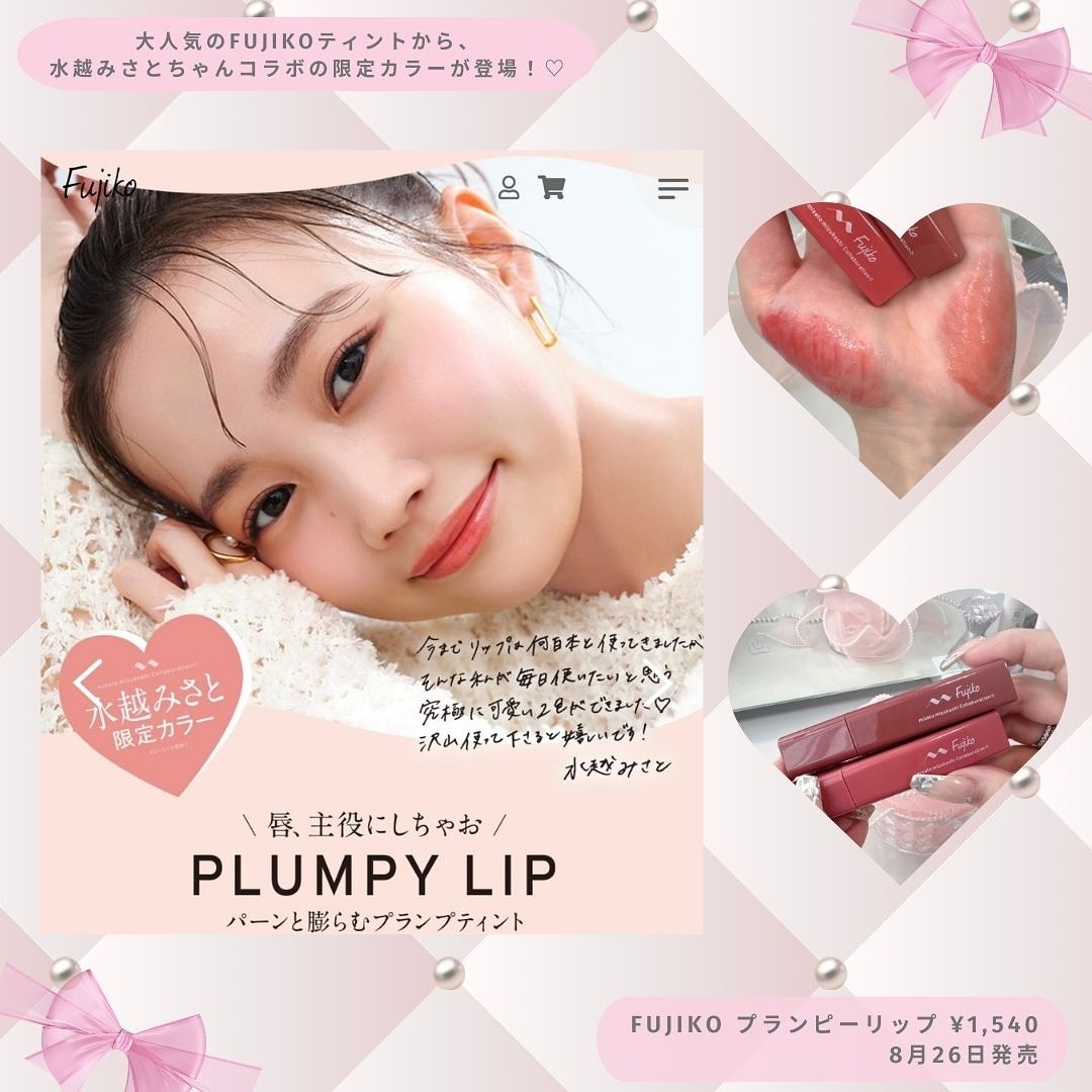 フジコの大人気ティントリップをご紹介。重ねるほどにパーンと膨らむ*プランプティント。*メイクアップ効果による ティント×プランパーの豪華ダブル処方でカラーも楽しみつつ、縦じわの気になりにくいぷるんとした唇に❤️ 水越みさとちゃんコラボ限定カラーはPLAZA アトレ恵比寿店・梅田ヘップファイブ店にて先行発売中。全国発売は2024年8月26日(月)から!