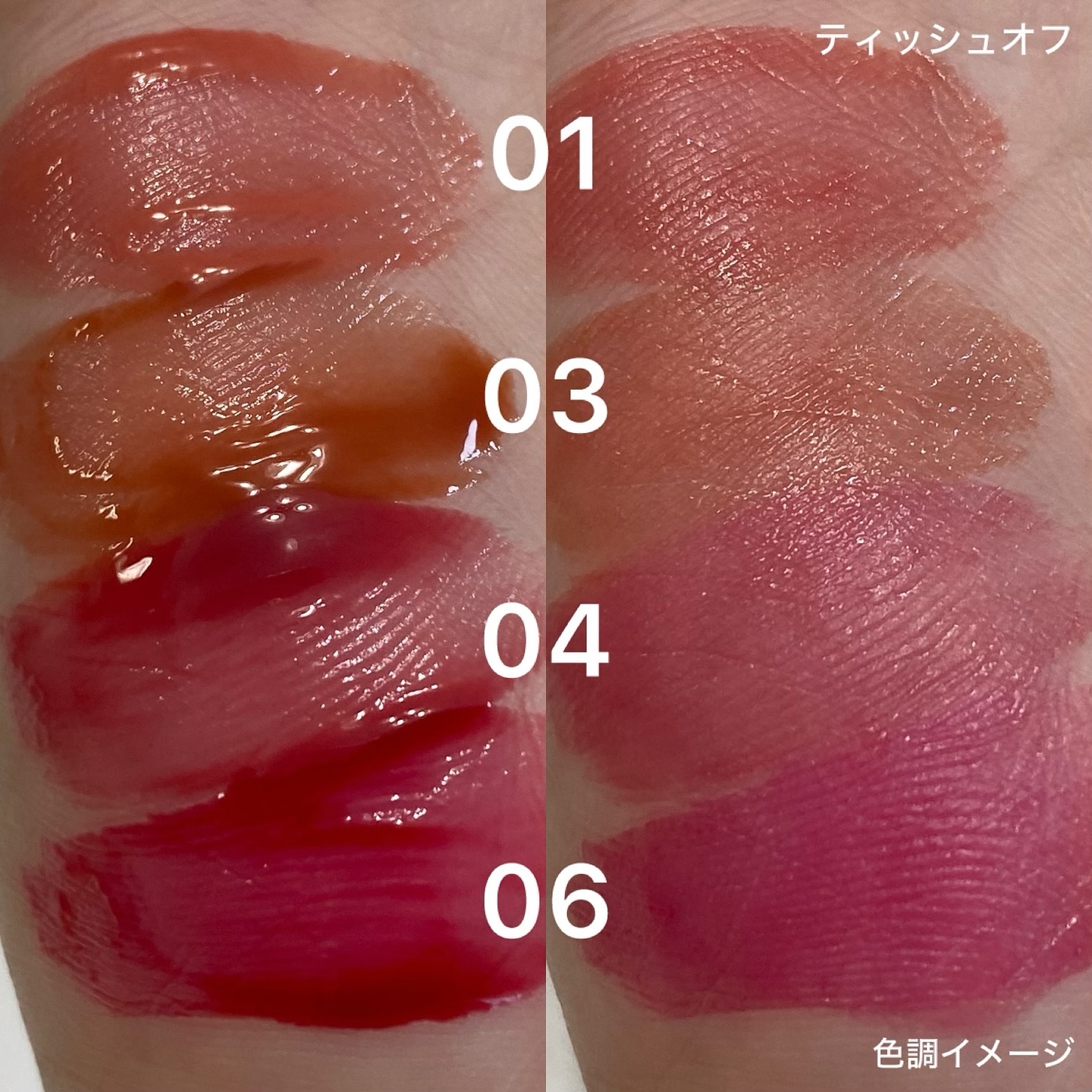 サラッとしたテクスチャーで薄膜仕上がり。ベタつきにくくじゅわっとみずみずしい発色のティントリップです。 ころんとしたパケも可愛い!アプリケーターもぽてっとしてるんですが安定感があって塗りやすいです◎ 明るめ得意なブルベ夏の私は02と04が特に気に入っています😍