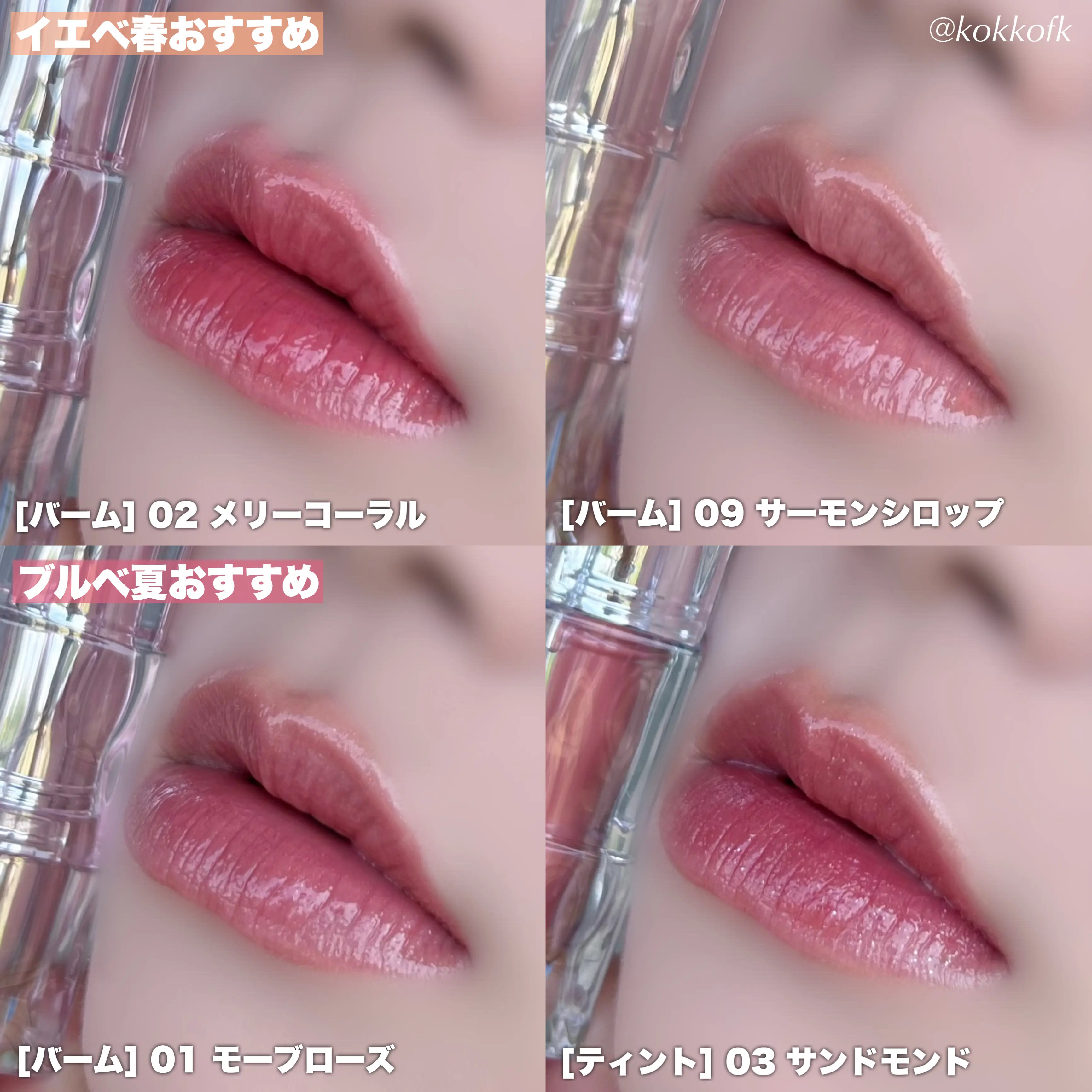 このバームはワセリンのようなとにかくうるうるの透明ツヤ感で、唇に負担なく薄づきの発色です💓 やや黄みの柔らかいヌードベージュ 明るさが得意なイエベ春におすすめ! 明るく澄んだ青みピンク 明るさが得意なブルベにおすすめ! やや黄みの澄んだコーラルレッド 2ndブルベのイエベ春におすすめ! 鮮やかで澄んだ青みレッド 鮮やかさが得意なブルベにおすすめ! 柔らかいくすみベージュブラウン 柔らかい色が得意なイエベにおすすめ! やや青みの柔らかいくすみレッド 柔らかい色が得意なブルベ夏に! しっかり青みのモーブピンク 1st2ndブルベにおすすめ!