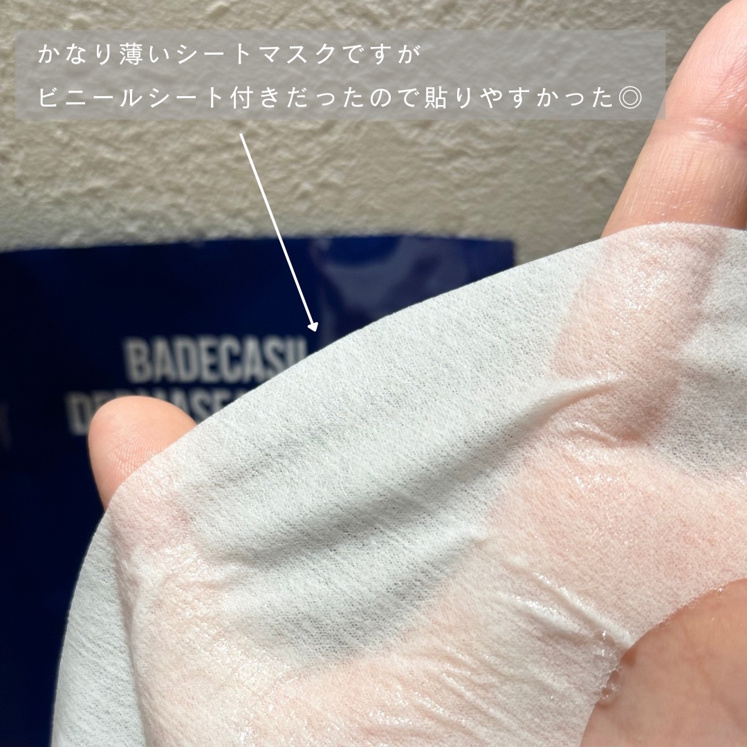 美容液がタプタプいっぱい入ってるのがわかりました。美容液は、トロミが少ないサラッとした液です。 肌への密着度はとても良かったです。15分ほど着用。 水分量がとても多くて、しっとり潤いました。角質ケアの成分も入ってるので、肌がツルッとした気がします。