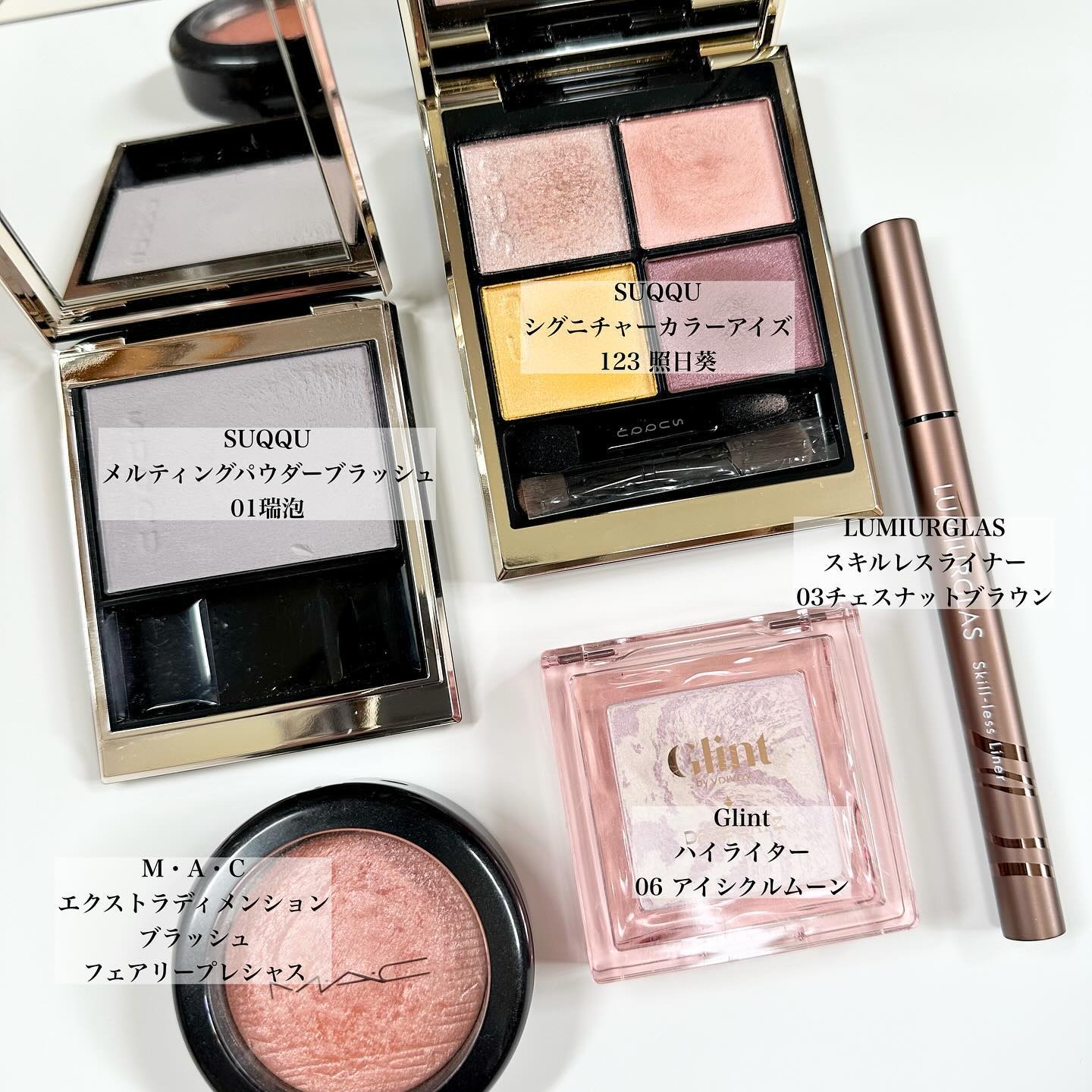 アイシャドウは実物の方が相当可愛い! 特に左上のラメの破壊力、、、 左側ボルドーは本当にふんわりと。 その上から右側のライラック?ピンクを 乗せると透明感爆発でした🥹👏🏻 本当にSUQQUは裏切らない可愛さ。 4月に発売されるもう一色のシグニチャーも、 5月発売のサマーもしっかり買うよ☺️❤️🔥