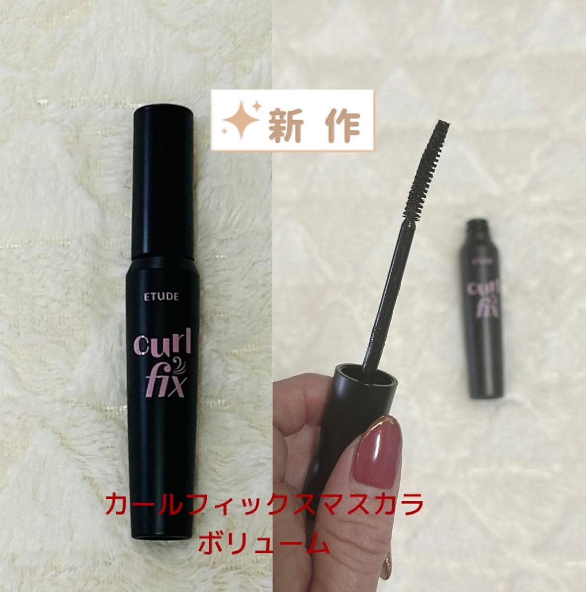 #エチュード の人気マスカラからボリュームタイプ登場🖤 既存のカールフィックスマスカラのブラシより細めで、四角にカッティングされ、目の曲線に沿ってカーブしたスクエアフィットブラシが特徴。 くっきりとしたクリアブラックで印象的なまつ毛を演出 細めのブラシなので、細かいことろにも使いやすくて、下まつ毛にも塗りやすいです。 まつ毛のカールを長時間キープしてくれる#マスカラ下地 カールキープ、ボリュームアップ、トップコートの1本3役👀