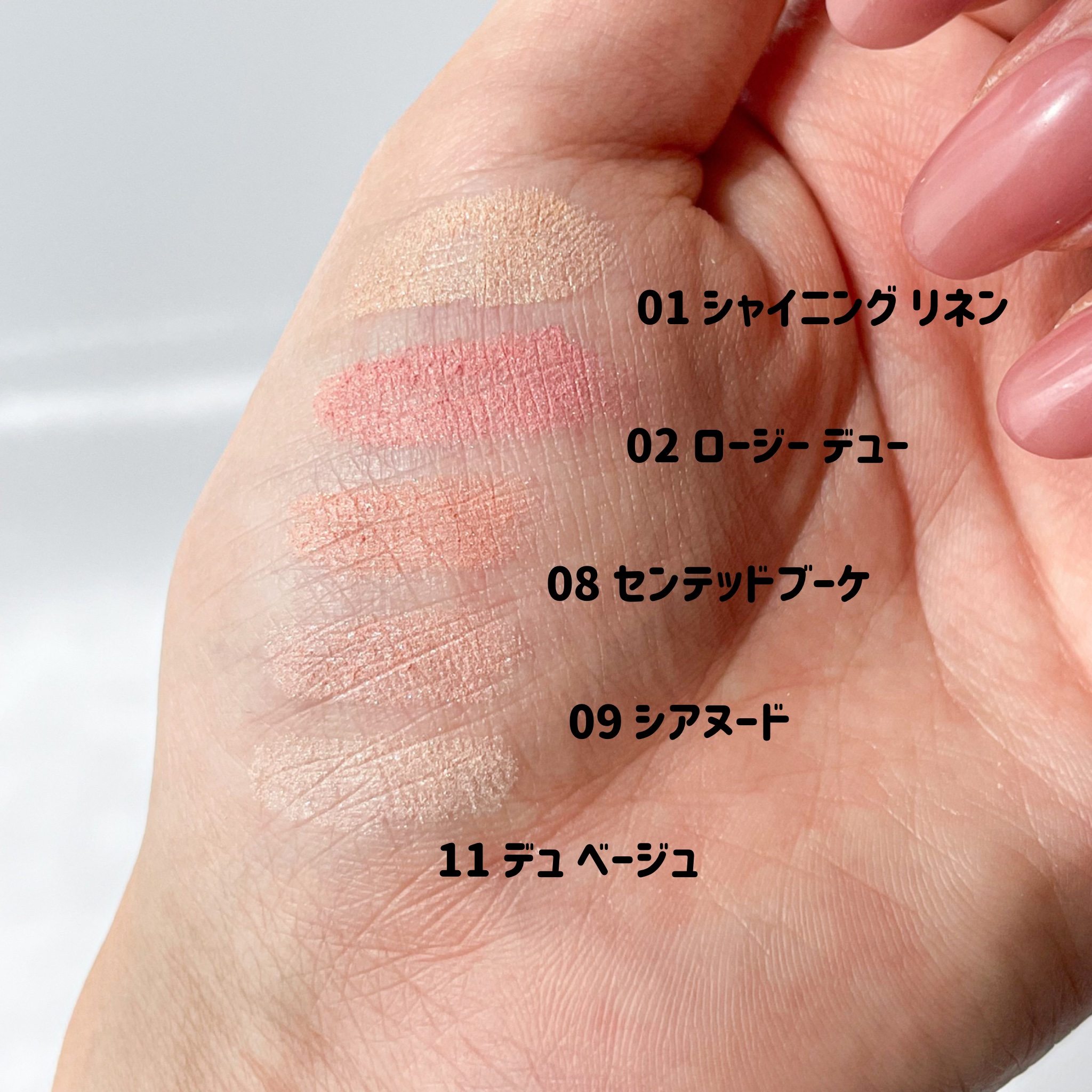 - <#1 Shining Linen(シャイニングリネン) > マイカ、酸化チタン、(ジメチコン/ジビニルジメチコン/シルセスキオキサン)クロスポリマー、シリカ、ナイロン-12、ポリメタクリル酸メチル、ベヘノキシPEG-10ジメチコン、ヤシ油脂肪酸イソアミル、ジメチコン、窒化ホウ素、合成フルオロフロゴパイト、ペンチレングリコール、トリ(ベヘン酸/イソステアリン酸/エイコサン二酸)グリセリル、酸化鉄、カプリリルグリコール、クエン酸トリエチル、ケイ酸(Al/Mg)、エチルヘキシルグリセリン、アルギン酸Na、ポリアクリル酸Na、カプリルヒドロキサム酸、グリセリン、酸化スズ、トコフェロール <#2 Rosy Dew(ロージーデュー)> 酸化チタン、マイカ、(ジメチコン/ジビニルジメチコン/シルセスキオキサン)クロスポリマー、シリカ、ナイロン-12、ポリメタクリル酸メチル、ベヘノキシPEG-10ジメチコン、ヤシ油脂肪酸イソアミル、酸化鉄、ジメチコン、窒化ホウ素、合成フルオロフロゴパイト、ペンチレングリコール、トリ(ベヘン酸/イソステアリン酸/エイコサン二酸)グリセリル、カプリリルグリコール、クエン酸トリエチル、コチニール、ケイ酸(Al/Mg)、エチルヘキシルグリセリン、アルギン酸Na、ポリアクリル酸Na、カプリルヒドロキサム酸、グリセリン、トコフェロール <#8 Scented Bouquet(センティッドブーケ) > マイカ、酸化チタン、(ジメチコン/ジビニルジメチコン/シルセスキオキサン)クロスポリマー、シリカ、ナイロン-12、酸化鉄、ポリメタクリル酸メチル、ベヘノキシPEG-10ジメチコン、ヤシ油脂肪酸イソアミル、ジメチコン、窒化ホウ素、合成フルオロフロゴパイト、ペンチレングリコール、トリ(ベヘン酸/イソステアリン酸/エイコサン二酸)グリセリル、カプリリルグリコール、クエン酸トリエチル、コチニール、ケイ酸(Al/Mg)、エチルヘキシルグリセリン、アルギン酸Na、ポリアクリル酸Na、カプリルヒドロキサム酸、グリセリン、トコフェロール <#9 Sheer Nude(シアーヌード)> マイカ、酸化チタン、(ジメチコン/ジビニルジメチコン/シルセスキオキサン)クロスポリマー、シリカ、ナイロン-12、ポリメタクリル酸メチル、ベヘノキシPEG-10ジメチコン、ヤシ油脂肪酸イソアミル、ジメチコン、窒化ホウ素、酸化鉄、合成フルオロフロゴパイト、ペンチレングリコール、トリ(ベヘン酸/イソステアリン酸/エイコサン二酸)グリセリル、カプリリルグリコール、クエン酸トリエチル、ケイ酸(Al/Mg)、エチルヘキシルグリセリン、アルギン酸Na、ポリアクリル酸Na、カプリルヒドロキサム酸、グリセリン、トコフェロール <#10 Classy Fig(クラッシィーフィグ)> マイカ、酸化チタン、(ジメチコン/ジビニルジメチコン/シルセスキオキサン)クロスポリマー、ホウケイ酸(Ca/Na)、シリカ、酸化鉄、ナイロン-12、ポリメタクリル酸メチル、ベヘノキシPEG-10ジメチコン、ヤシ油脂肪酸イソアミル、ジメチコン、窒化ホウ素、合成フルオロフロゴパイト、ペンチレングリコール、トリ(ベヘン酸/イソステアリン酸/エイコサン二酸)グリセリル、カプリリルグリコール、クエン酸トリエチル、ケイ酸(Al/Mg)、カルミン、エチルヘキシルグリセリン、アルギン酸Na、ポリアクリル酸Na、カプリルヒドロキサム酸、グリセリン、酸化スズ、トコフェロール <#11 Dew Beige(デューベージュ)> 酸化チタン、マイカ、ホウケイ酸(Ca/Na)、(ジメチコン/ジビニルジメチコン/シルセスキオキサン)クロスポリマー、シリカ、ナイロン-12、ポリメタクリル酸メチル、ベヘノキシPEG-10ジメチコン、ヤシ油脂肪酸イソアミル、ジメチコン、窒化ホウ素、合成フルオロフロゴパイト、ペンチレングリコール、トリ(ベヘン酸/イソステアリン酸/エイコサン二酸)グリセリル、カプリリルグリコール、クエン酸トリエチル、ケイ酸(Al/Mg)、酸化鉄、エチルヘキシルグリセリン、アルギン酸Na、ポリアクリル酸Na、カプリルヒドロキサム酸、グリセリン、酸化スズ、コチニール、マルトデキストリン、トコフェロール