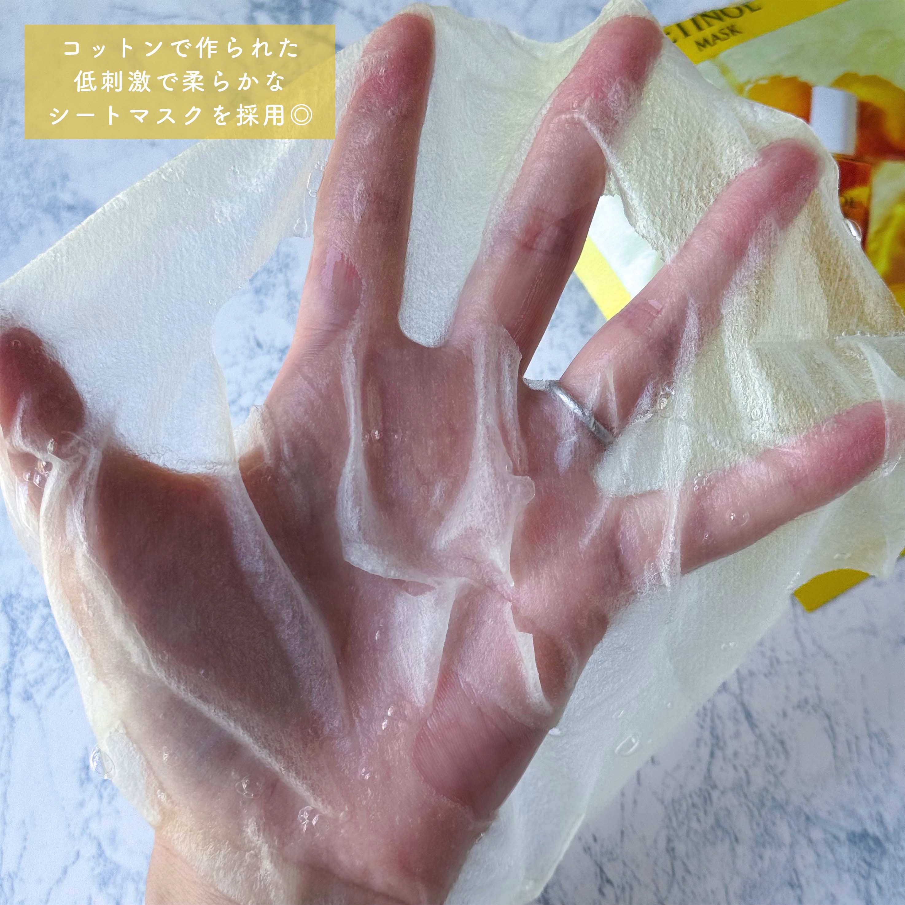 - 肌に配慮した配合量のレチノール(整肌成分)に加え、ビタミンC(アスコルビン酸)やAHA(クエン酸)、PHA(グルコノラクトン)などの整肌成分が配合された美容液を柔らかいシートで肌に密着。 週に2~3回、気になる肌キメ・ハリ・毛穴(乾燥による)のケアに。