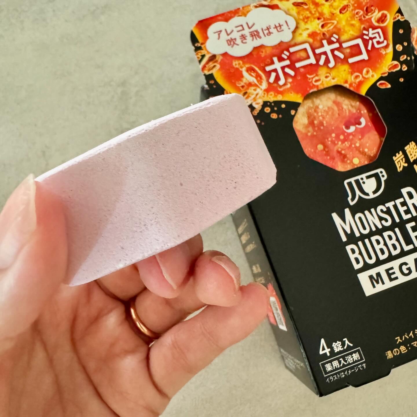 - 【医薬部外品】 この発散*1入浴、きっとクセになる。 溜まったアレコレ吹き飛ばして、じっくりオフロを楽しもう! 湯面湧きたつボコボコ泡。 ●MEGAタブレット*2 ●炭酸量MAX*3 ●温浴効果を高め、疲労回復 ●スパイシーエナジーの香り *1炭酸泡がはじけること *2比較対象:当社バブモンスターバブルかろやかDAYS *3モンスターバブルMEGA級シリーズとして、バブ製品内で炭酸量が最大 湯の色:マグマレッド(色つき透明) スパイシーエナジーの香り