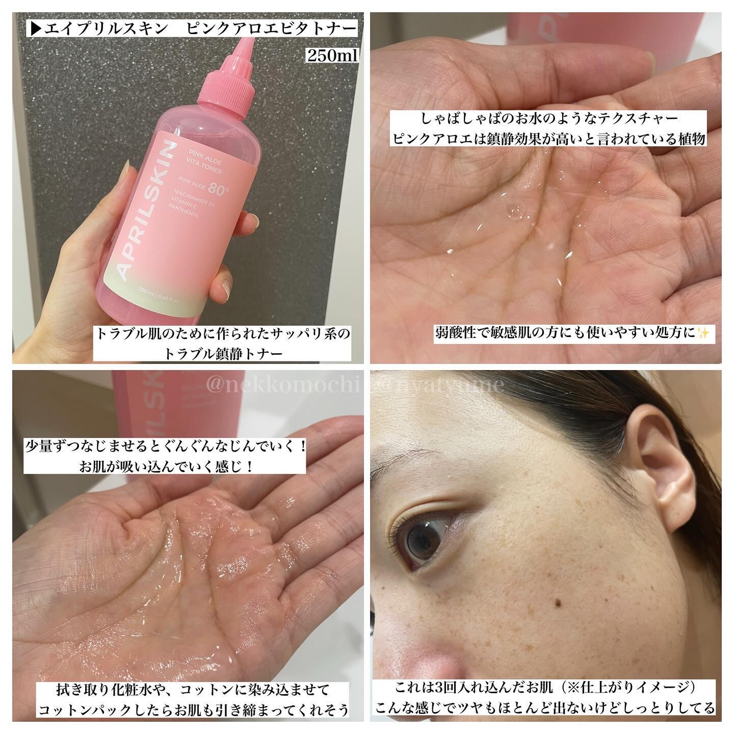 ピンクアロエビタトナーはトラブル肌のために作られたさっぱり系トラブル鎮静トナー。 鎮静効果がより高いピンクアロエが80%配合! 拭き取り化粧水としてもクールダウンパックとしても使えるから肌の水分補給をして急速に鎮静が期待できるよ! ほんのりピンクのトナーで、さらっとしたテクスチャー! 塗るとぐんぐん浸透して乾燥してつっぱったも吸いつくようなもっちり肌に✨