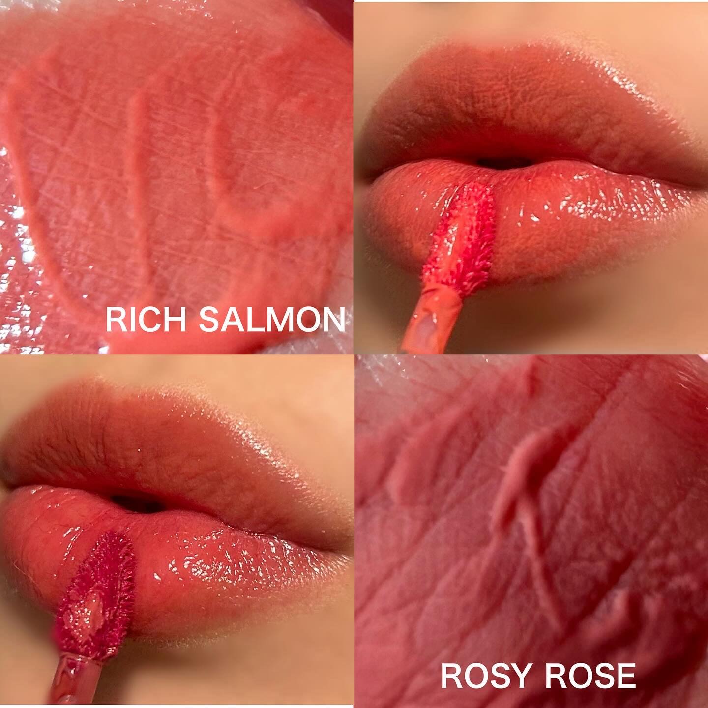 果汁のようなジューシーなリップティント🍊 RICH SALMONはミルキーなサーモンオレンジで可愛くフレッシュな仕上がりに🫶 ROSY ROSEは少しくすんだローズカラーで大人っぽく落ち着いた印象になって好き🥀 リップだけではなく、チークにも使えるの!発色が良くて時間がたってもちゅるんと感が続く〜✨