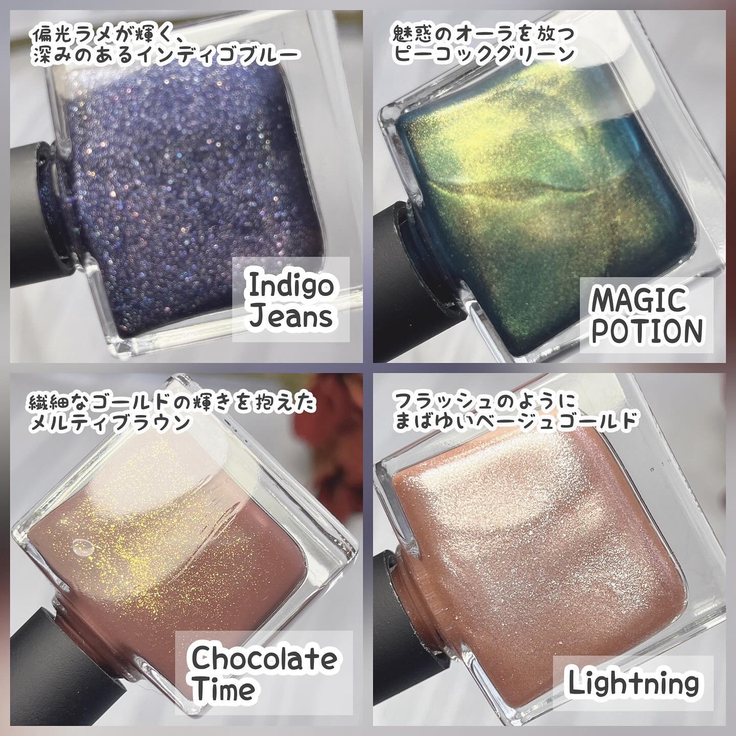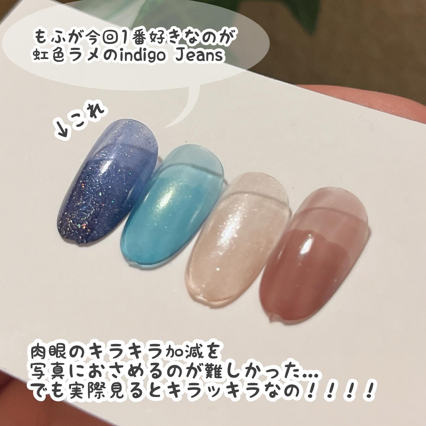 新色はスパークル×ヴィンテージカラーで秋にぴったりなカラー🍁 カラーバリエーションは全4色。ブラウン、シアーベージュ、インディゴブルーなど秋冬のトレンドを反映したシーズンムードを高めるラインナップ♡ 繊細ラメや偏光微粒子パールが入っていてとにかくキラキラでかわいいいいい😭💕 キラキラ好きさんにはたまらないカラーです!!! 041 Indigo Jeans (インディゴジーンズ) 偏光ラメが輝く、深みのあるインディゴブルー