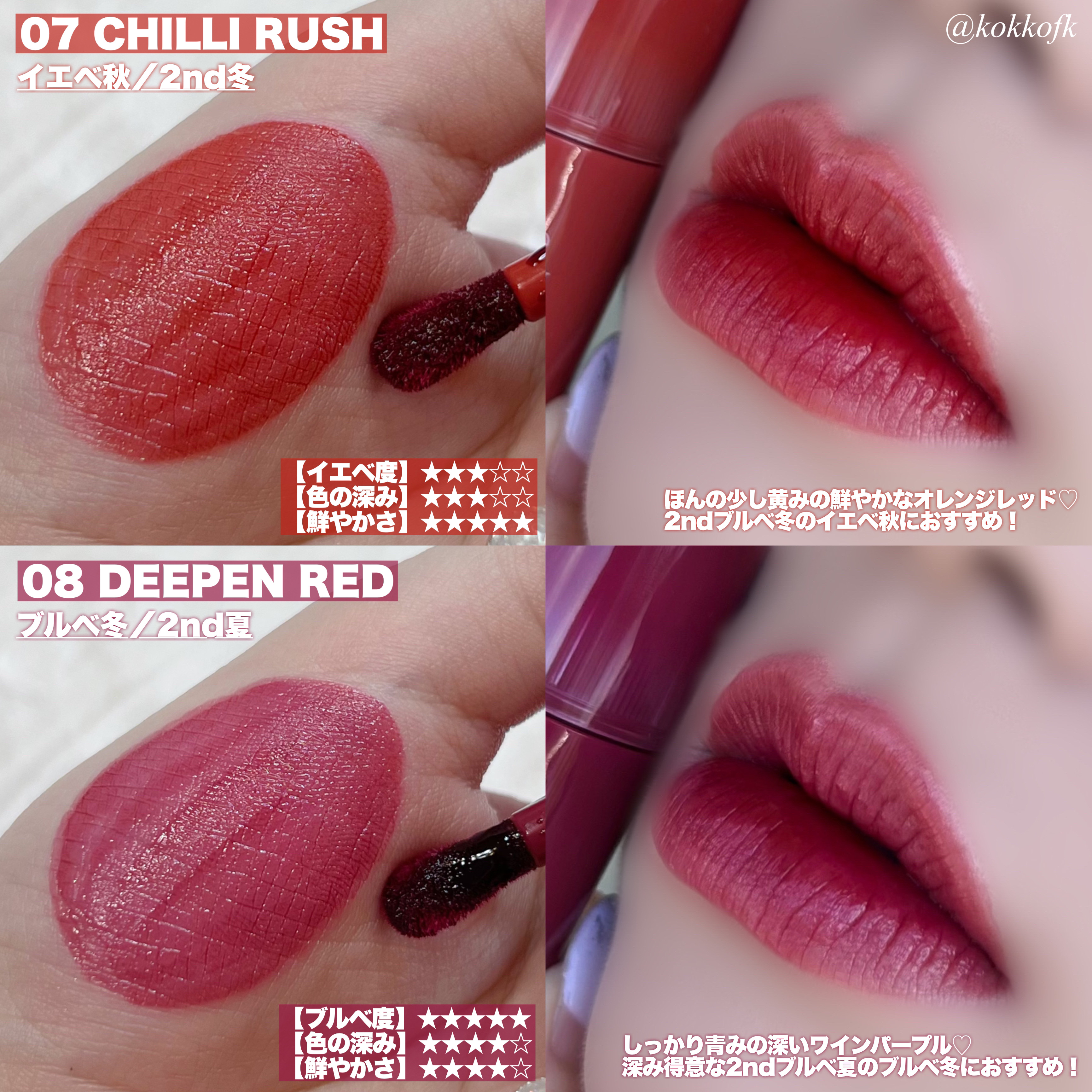 薄く唇に密着する新作マットティント。 マットなのにかなりしっとりとしていて 乾燥を感じなくてびっくりでした! 一気にこなれ感が出るトレンドカラーです♡ やや青みの華やかローズレッド 公式画像より鮮やかめに感じました。 やや黄みの強くて深いオレンジレッド ストロングオータムに超激推しです! やや黄みの非常に深く濃いダークブラウン ディープオータムに激推しです! かわいい雰囲気になれるピンクリップです♡ やや青みの柔らかいくすみピンクベージュ ミューテッドサマーにおすすめです! 青みの落ち着いたローズピンク やや青みのとても鮮やかなビビッドレッド ビビッドウィンターに特におすすめ! 既存マットティントよりもさらに ふわふわなマット感が魅力のリップで、 軽くティッシュオフしてもほとんど落ちない◎ マスクにも激推しのティントなので、 ぜひ皆さんもチェックしてみてね❤︎