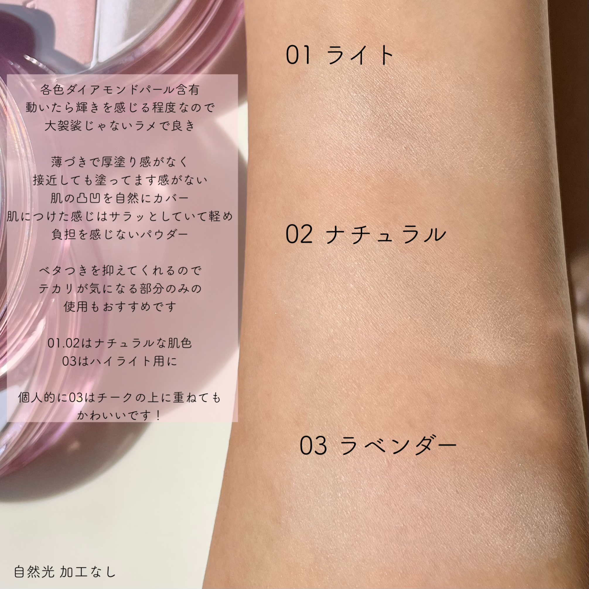 - <01 ライト> タルク、マイカ、トリ(カプリル酸/カプリン酸)グリセリル、窒化ホウ素、シリカ、ジメチコン、ナイロンー12、メタクリル酸メチルクロスポリマー、合成ミツロウ、リンゴ酸ジイソステアリル、カプリル酸グリセリル、エチルヘキシルグリセリン、ステアリン酸ジメチコノール、水、酢酸トコフェロール、ダイヤモンド末、ハスエキス、BG、1,2ーヘキサンジオール、ペンチレングリコール、ヒアルロン酸Na、モモ果実エキス、ヒドロキシアセトフェノン、フェノキシエタノール、アセチルヒアルロン酸N a、加水分解ヒアルロン酸、加水分解ヒアルロン酸Na、ヒアルロン酸、酸化鉄、酸化チタン、香料 <02 ナチュラル> タルク、マイカ、トリ(カプリル酸/カプリン酸)グリセリル、窒化ホウ素、シリカ、ジメチコン、ナイロンー12、メタクリル酸メチルクロスポリマー、合成ミツロウ、リンゴ酸ジイソステアリル、カプリル酸グリセリル、エチルヘキシルグリセリン、ステアリン酸ジメチコノール、水、酢酸トコフェロール、ダイヤモンド末、ハスエキス、BG、1,2ーヘキサンジオール、ペンチレングリコール、ヒアルロン酸Na、モモ果実エキス、ヒドロキシアセトフェノン、フェノキシエタノール、アセチルヒアルロン酸N a、加水分解ヒアルロン酸、加水分解ヒアルロン酸N a、ヒアルロン酸、酸化鉄、酸化チタン、香料 <03 ラベンダー> タルク、マイカ、トリ(カプリル酸/カプリン酸)グリセリル、窒化ホウ素、シリカ、ジメチコン、ナイロンー12、メタクリル酸メチルクロスポリマー、合成フルオロフロゴパイト、合成ミツロウ、リンゴ酸ジイソステアリル、カプリル酸グリセリル、エチルヘキシルグリセリン、ステアリン酸ジメチコノール、酢酸トコフェロール、ダイヤモンド末、水、ハスエキス、BG、ローブッシュブルーベリー果実エキス、クマイチゴ果実エキス、マグワ果実エキス、1,2ーヘキサンジオール、ペンチレングリコール、ヒアルロン酸Na、ヒドロキシアセトフェノン、フェノキシエタノール、アセチルヒアルロン酸N a、加水分解ヒアルロン酸、加水分解ヒアルロン酸Na、ヒアルロン酸、酸化チタン、グンジョウ、赤201、香料