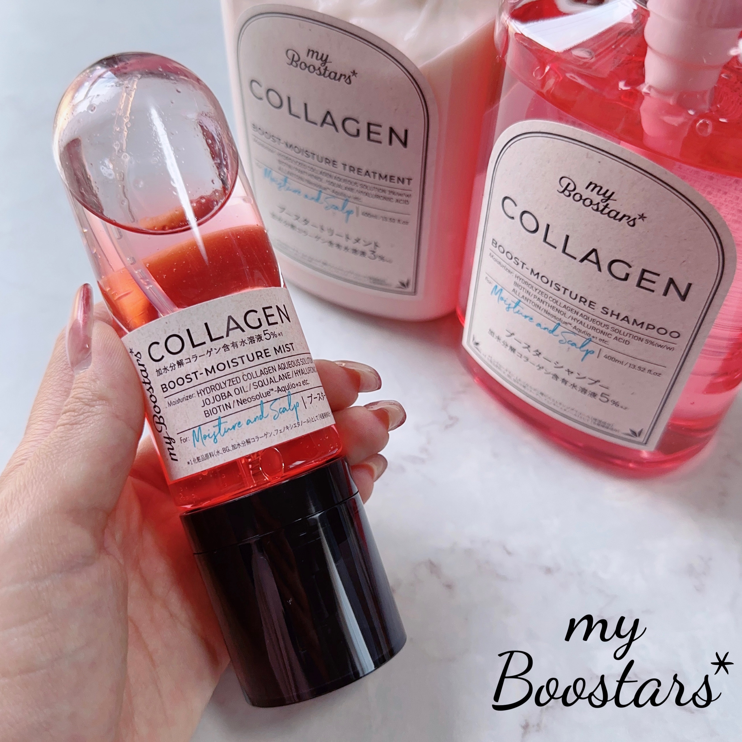 加水分解コラーゲン配合、スキンケア発想から生まれたブースターシャンプーとトリートメント シャンプーはとろみのあるテクスチャで少量でもこもこ泡立ちが良い✨ ブースターミストは美容オイル層と美容液層の2層式でこれだけでとぅるんと潤うから今使っているシャンプーに足すだけでもおすすめ!