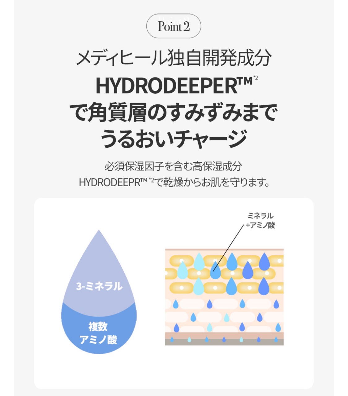 必須保湿因子を含むメディヒール独自開発の高保湿成分「ハイドロディーパー」と8種のヒアルロン酸を配合。 角質層の隅々までお肌の潤いをチャージ。乾燥からお肌を守ってくれる。 敏感肌対象パッチテスト済み。(すべての方に肌トラブルが起きないということではありません)