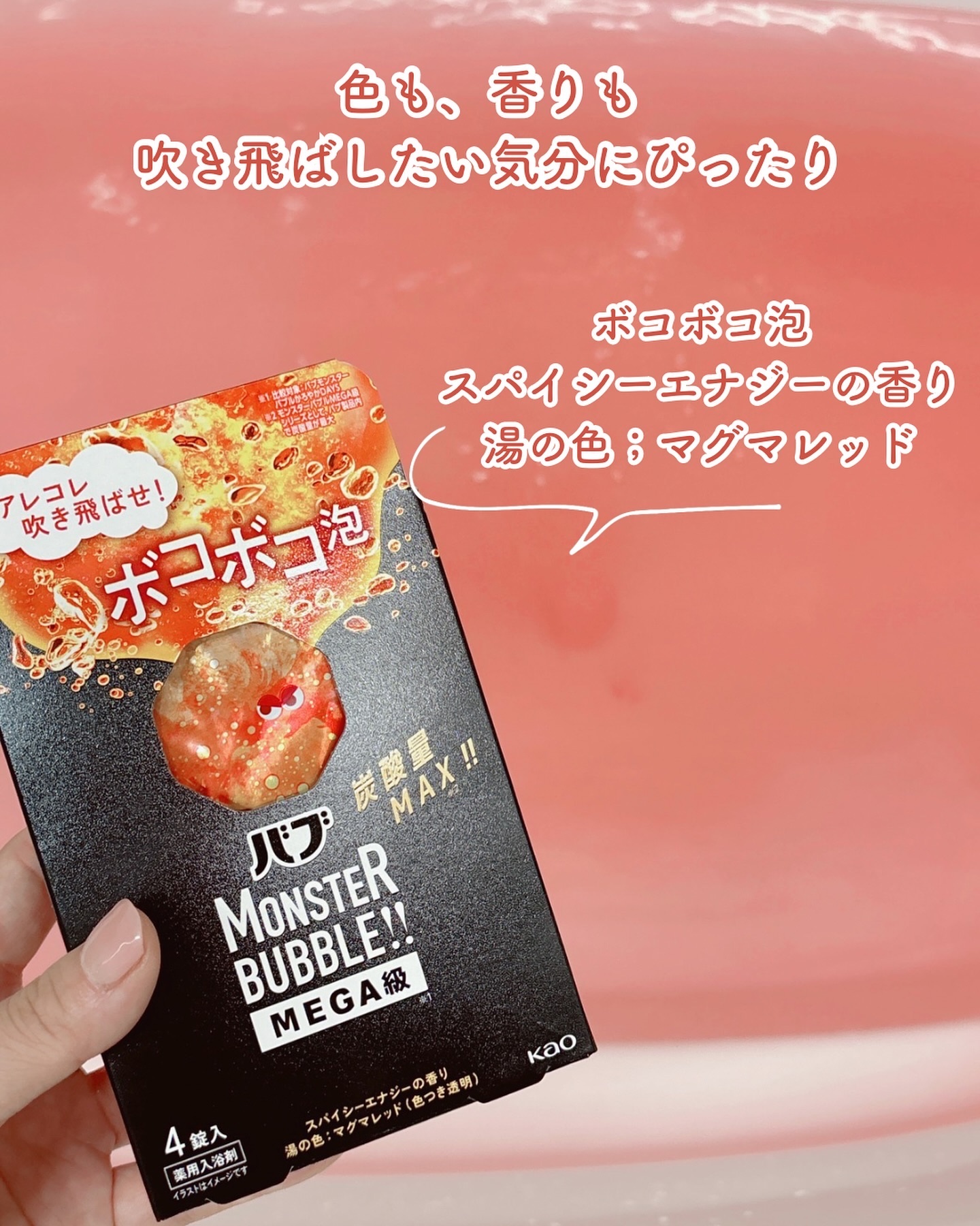 - 【医薬部外品】 この発散*1入浴、きっとクセになる。 溜まったアレコレ吹き飛ばして、じっくりオフロを楽しもう! 湯面湧きたつボコボコ泡。 ●MEGAタブレット*2 ●炭酸量MAX*3 ●温浴効果を高め、疲労回復 ●スパイシーエナジーの香り *1炭酸泡がはじけること *2比較対象:当社バブモンスターバブルかろやかDAYS *3モンスターバブルMEGA級シリーズとして、バブ製品内で炭酸量が最大 湯の色:マグマレッド(色つき透明) スパイシーエナジーの香り