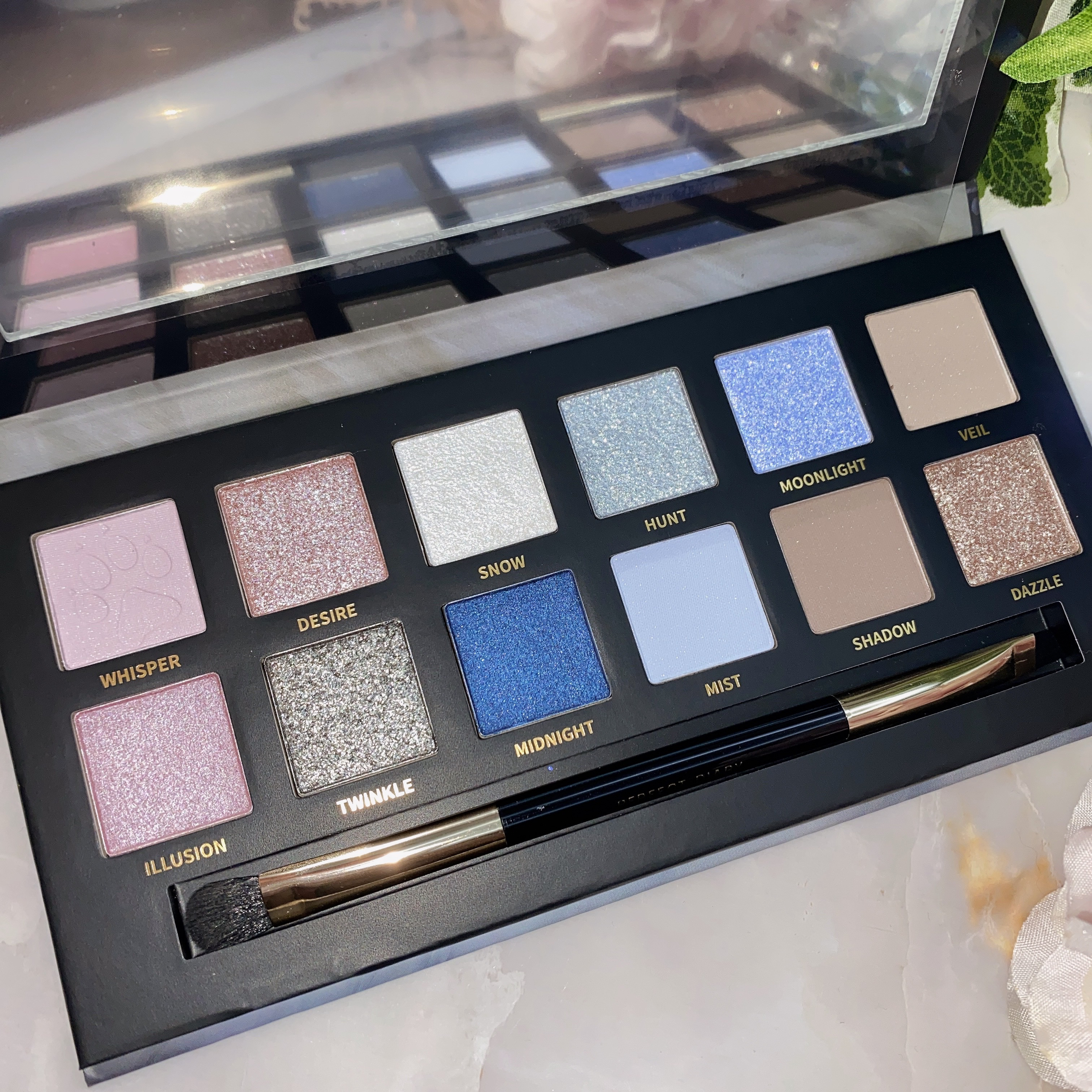 開いた瞬間綺麗すぎて衝撃だった…! 淡いひんやりブルーやピンク、ホワイトにネイビーがアクセントに。 ブルーのアイシャドウって難しいイメージがあるんだけど、 これは淡いアイシーカラーが多いから案外使いやすい! とにかくラメの多い配色! 12色中半分以上はラメ入りかな??