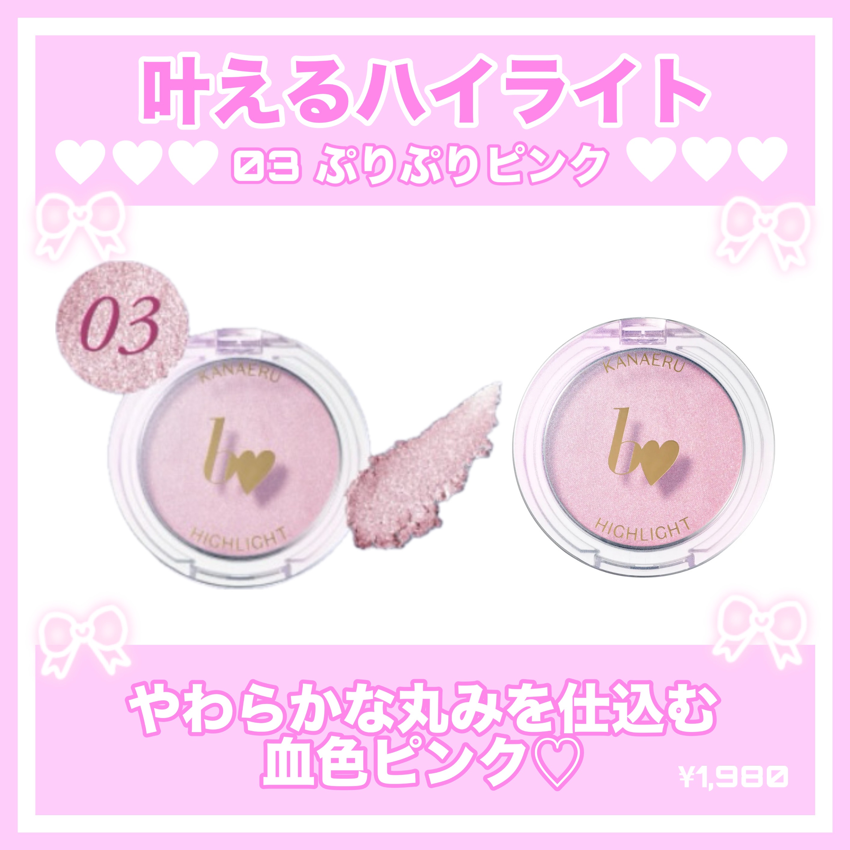 - b idolから新定番! 私にかける、魔法の光。 叶えるハイライト \立体感*血色*透明感/ 欲しいところにプラスする、シルキータッチなハイライト 骨格ベージュで顔全体をフラットになじませて、 鼻高ホワイトで鼻筋や額、高く見せたい所にポイント使い♪ ぷりぷりピンクはチーク使いでかわいく仕込む♡ お肌のことを考えた美容成分*配合なので使いやすい◎ マルチに使える3色展開!コンパクトなのでもち運びにもとっても便利。 *ティーツリー葉油、ヒアルロン酸Na、セラミドNP(全て保湿成分) <01 骨格ベージュ> 自然に溶け込む立体ベージュ <02 鼻高ホワイト> 透明感をひきあげるポイントマーブル <03 ぷりぷりピンク> やわらかな丸みを仕込む血色ピンク ※全てメイクアップ効果