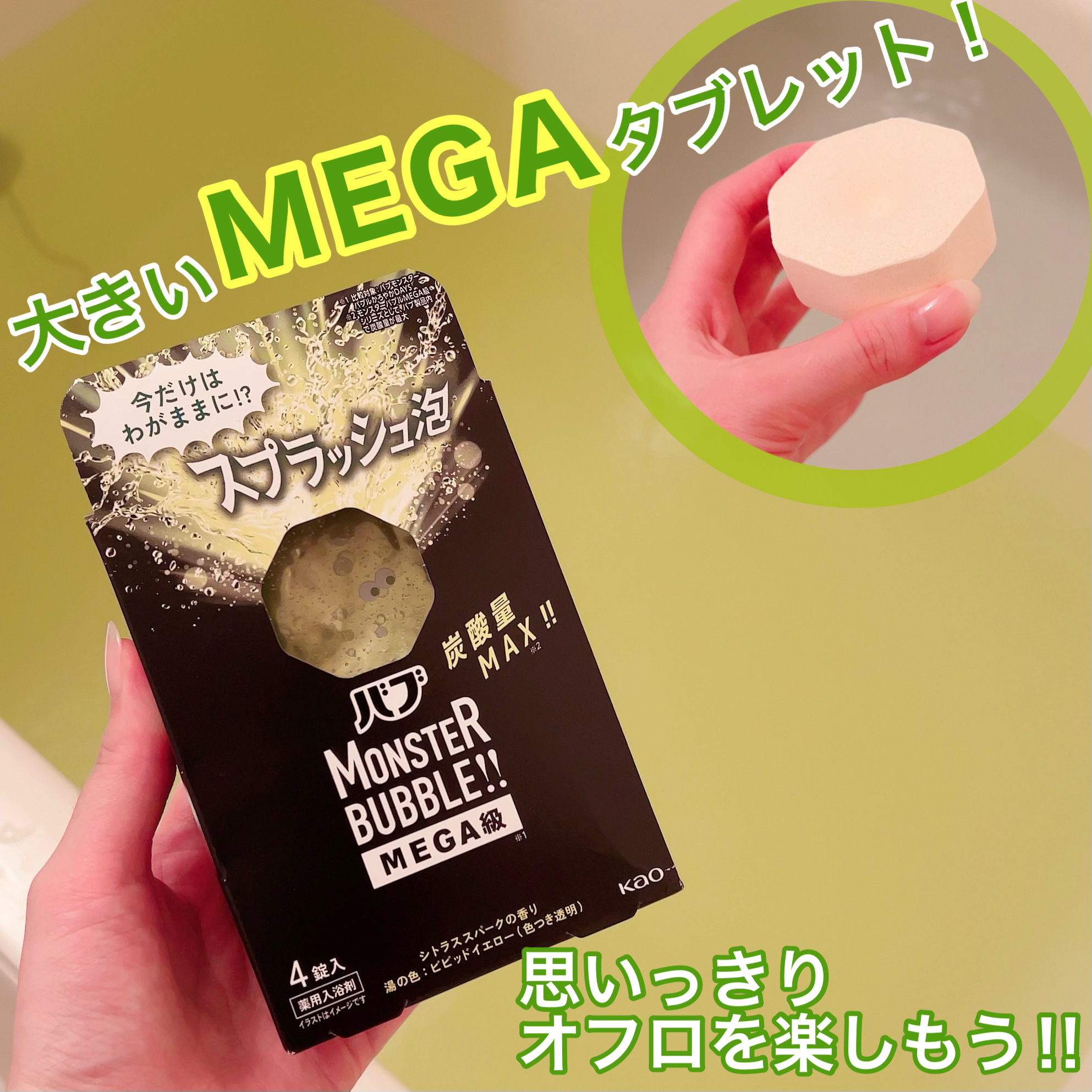 - 【医薬部外品】 この発散*1入浴、きっとクセになる。 今だけは自分にわがままに、思いっきりオフロを楽しもう! シュワっとはじけるスプラッシュ泡。 ●MEGAタブレット*2 ●炭酸量MAX*3 ●温浴効果を高め、疲労回復 ●シトラススパークの香り *1炭酸泡がはじけること *2比較対象:当社バブモンスターバブルかろやかDAYS *3モンスターバブルMEGA級シリーズとして、バブ製品内で炭酸量が最大 湯の色:ビビッドイエロー(色つき透明) シトラススパークの香り