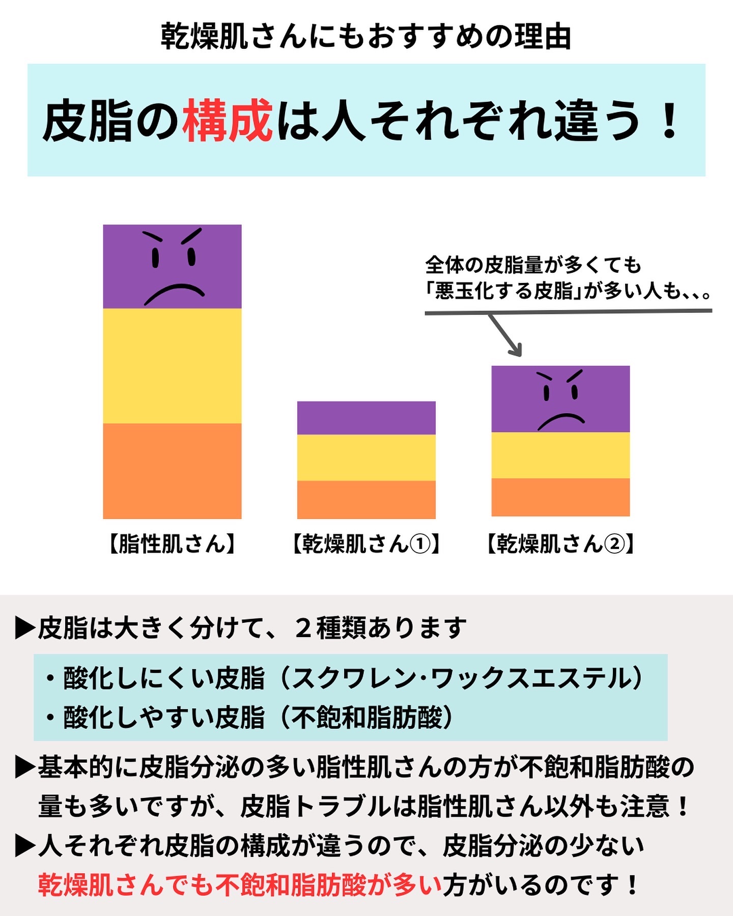 二層式の化粧水でよく振ってから使用。 水分と油分がバランスよく入っていて肌がみずみずしく、もっちりした感じに!! 悪玉化した皮脂をトラップ✨ 使った感想としては、肌トラブルが気にならなくなり、肌がすごく健やかになった気がする!!! 脂性肌さんや、皮脂が気になる春夏にオススメ! 私も夏になったらまたリピする!!