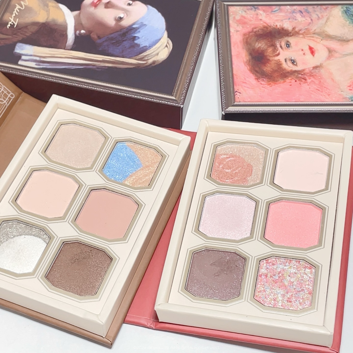 柔らかい色味と真珠やドレープのデザインが印象的なパレット。 絵画の世界観が忠実に表現されてて眼福🥹 特に左上のパール見てほしい!この光り方、まさに真珠じゃない!?💫 使いやすいかつオシャレなパレット。 絵画アイシャドウパレットはカラバリも豊富なのでお気に入りの色味が見つかるはず!
