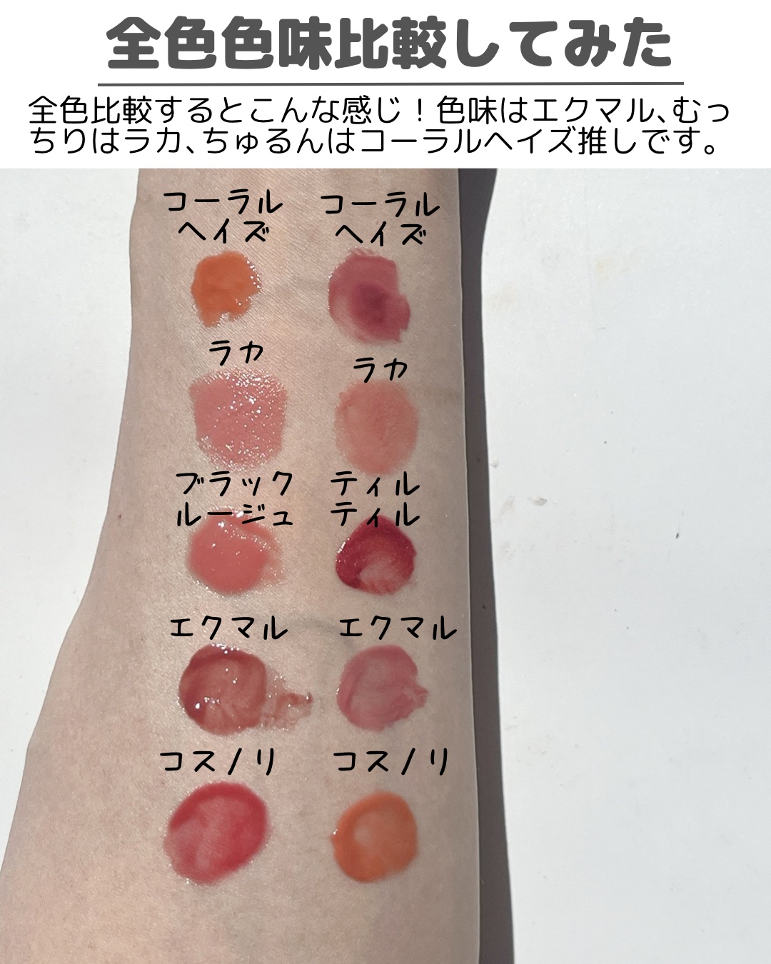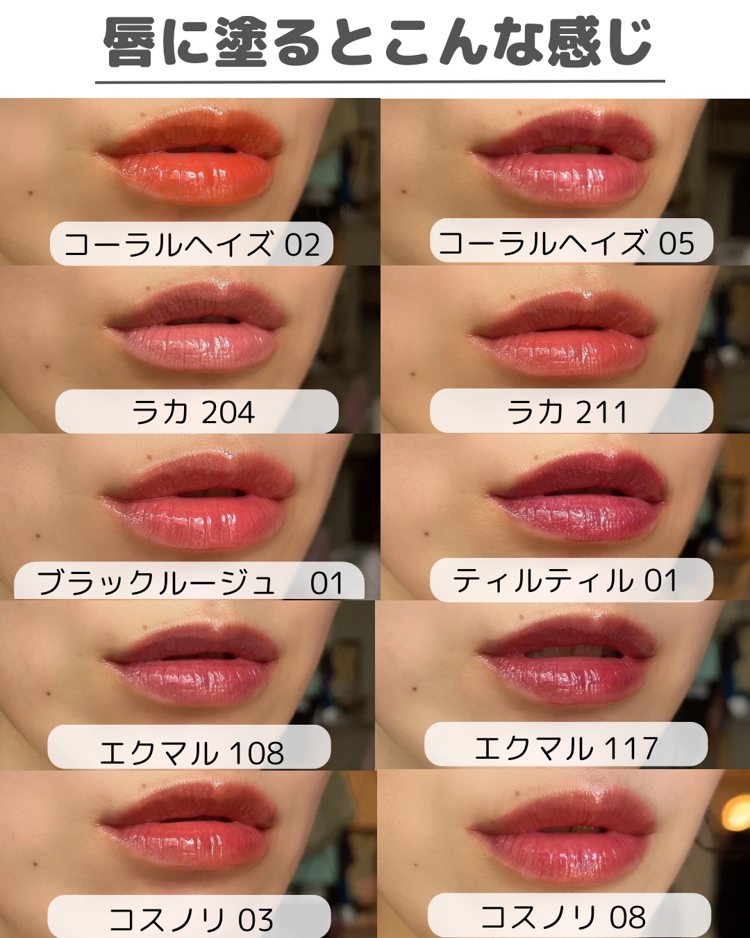 発色はけっこうよくて一度塗りでもしっかり色づく。 色持ちはティントじゃないからそこまでよくはないかな。 ツヤ感、透明感ありでどんなメイクの時にも使いやすい。 唇の血色悪い人はこの透明感で思ってたより発色しないかもしれない。 唇の血色いい人はヴィセの方が合ってそう。