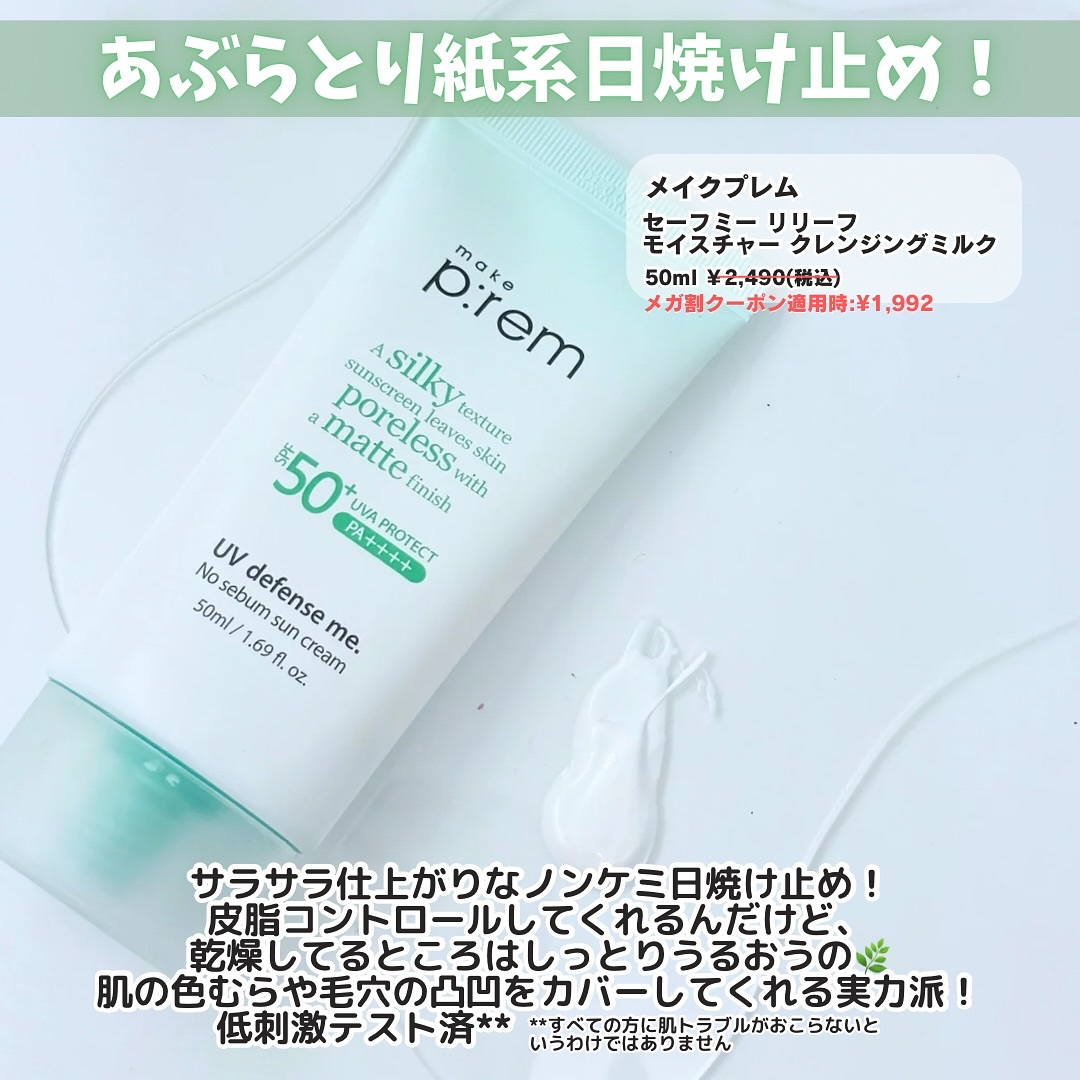 【肌に優しい日焼け止め・クレンジング🌻✧】♦makeprem・UVディフェンスミーノーセバムサンクリーム・セーフミーリリーフモイスチャークレンジングミルク200mlmakepremは、はりんちゃんの動画で知って化粧水とかクリームを一度使用した...