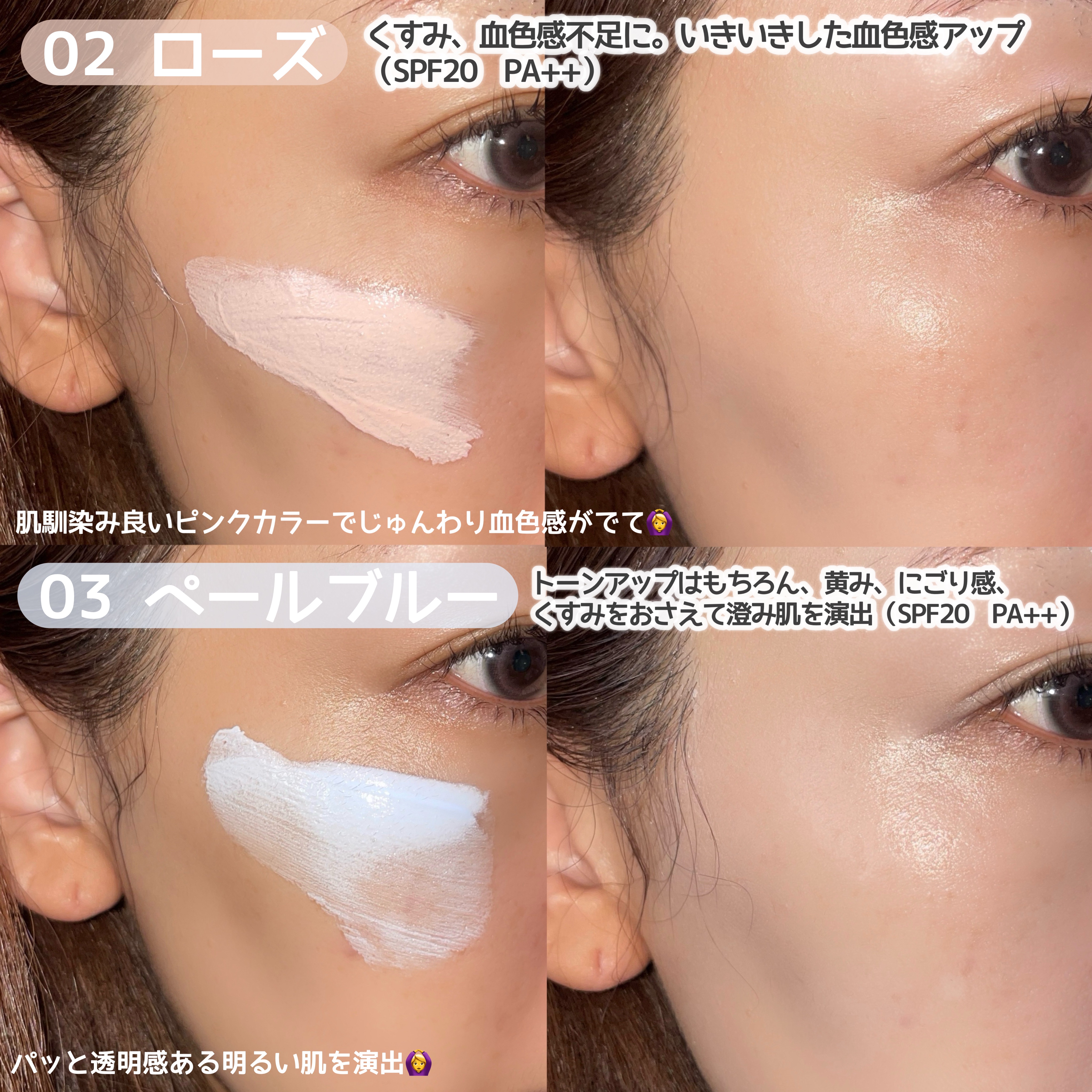 密着力や持続力がアップし、新色(クリア)も追加となりました。 ペールブルーは、トーンアップはもちろん、黄み、にごり感、くすみをおさえて澄み肌を演出してくれるカラーなんだそう。 澄み肌という言葉がぴったりな仕上がり。