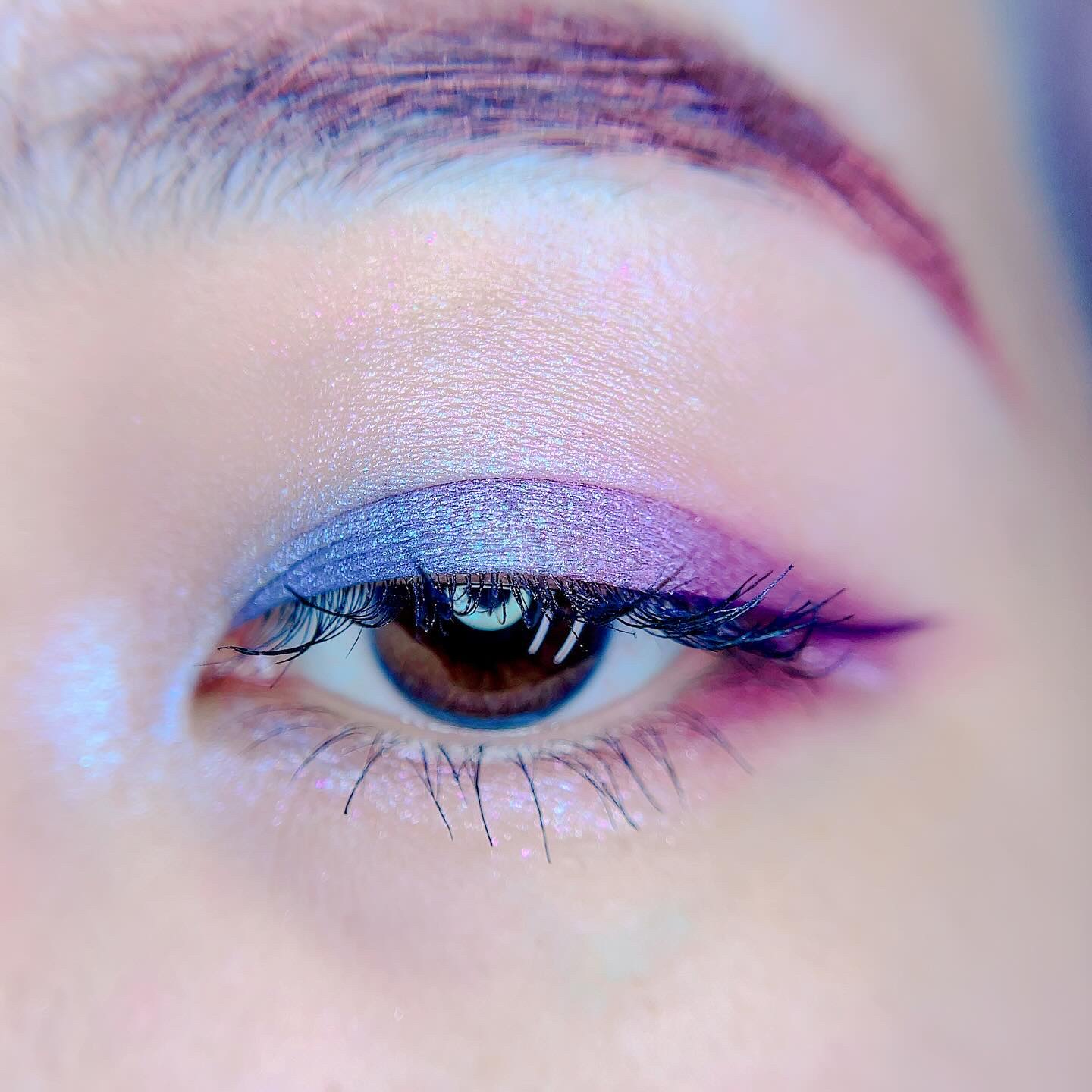 ベースに右上、目頭から黒目上に真ん中、黒目〜目尻に右下を、左上を目頭にくの字に塗ってもらいました✨ ピンクサクラよりもクールな感じで、目で見た色より私の肌では紫っぽく発色しました😍 上2つはラメはぎっしりでときめく💓 ブラウンメイクがとても苦手だけれどこれならブラウンメイク出来そう👌(かなり紫寄りですが) くすみ感は強いので苦手な方は厳しいかも…(特に真ん中) クールな印象になるので大人顔さん向けor大人顔になりたい方向けのイメージです✨