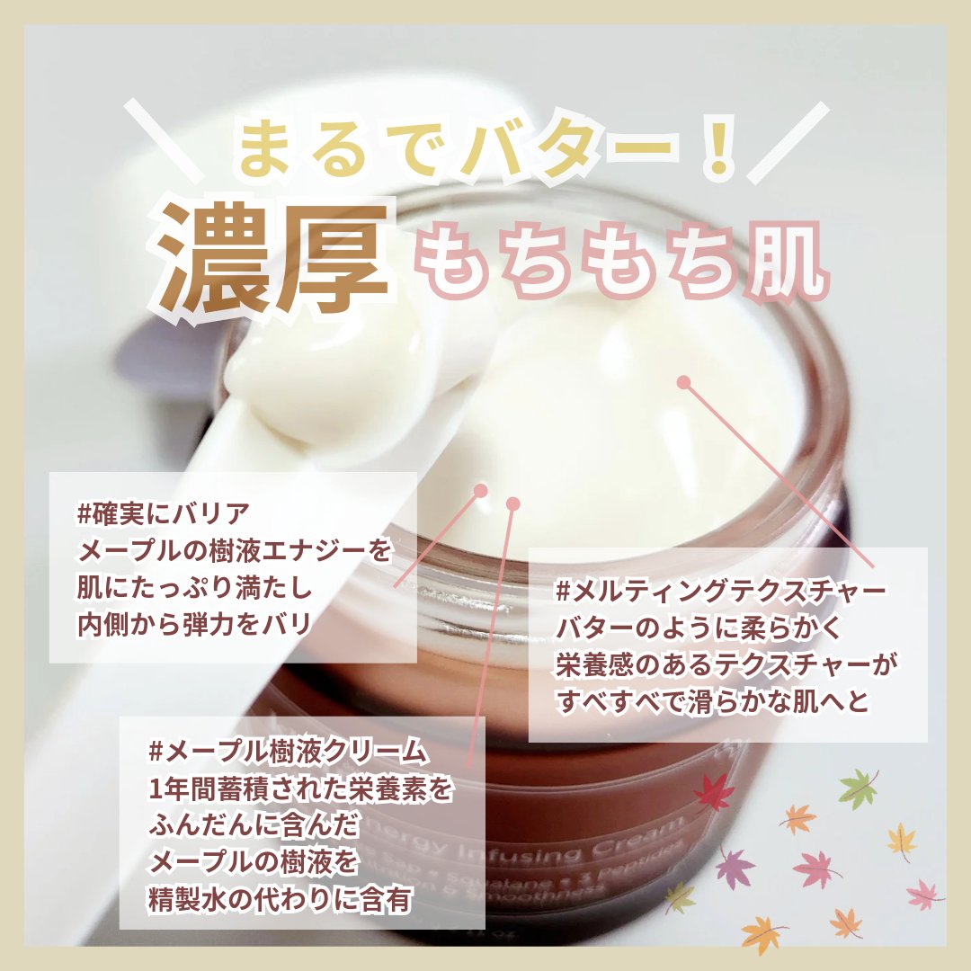 メープルの樹液とは?氷点下5度から20度に迫るカナダの厳しい冬を乗り越えるために蓄えている水分で、栄養素が豊富で保湿力に長けた液体です。 バターのように柔らかく栄養感のあるテクスチャーがすべすべで滑らかな肌へとケアしてくれます。 メープルの樹液パワーで水分をしっかり保ってくれている感じがして、翌朝はもっちりとハリのあるお肌になった感じです!