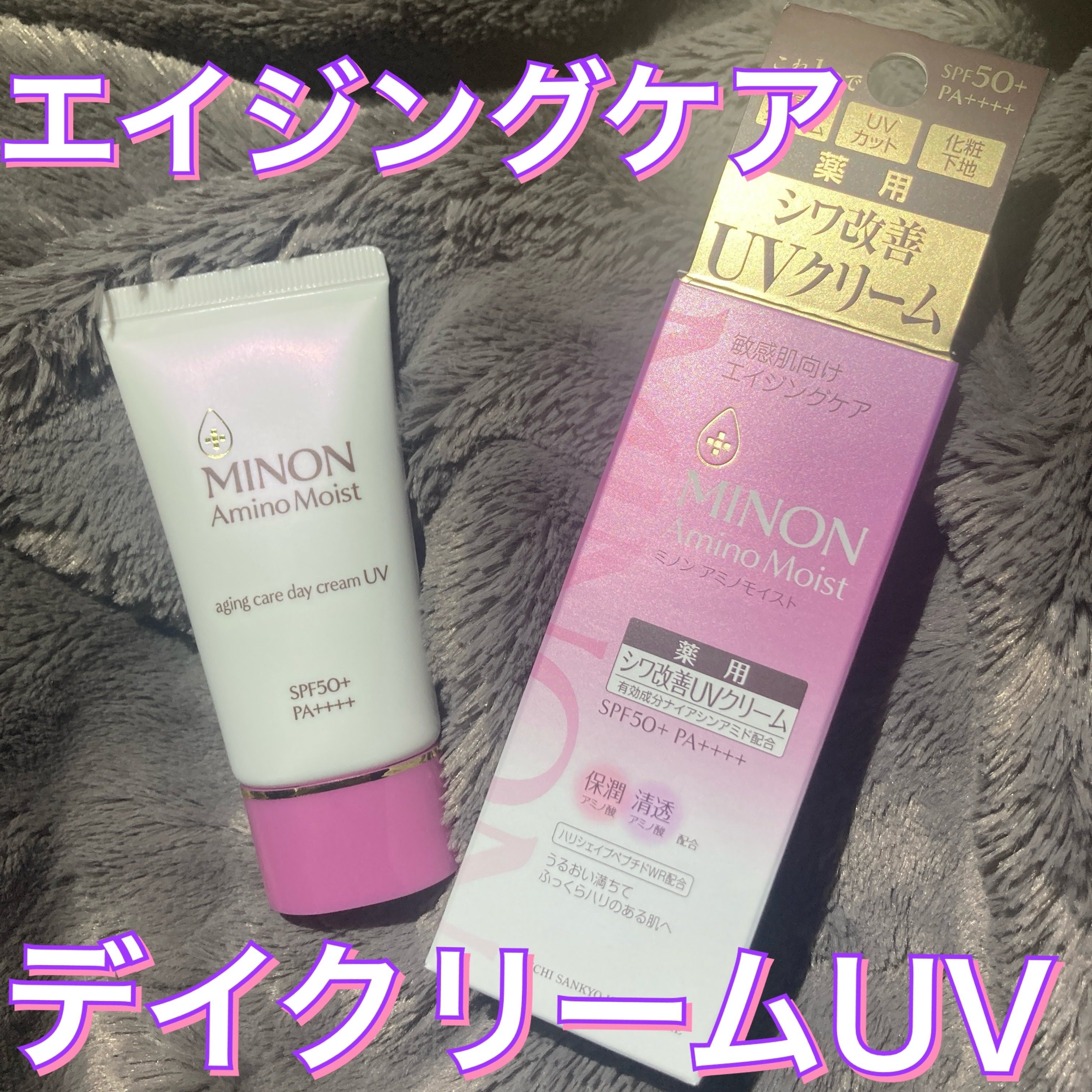- 【シワ改善もできるUVクリーム】 SPF50+PA++++ シワ改善×UVカットが出来る薬用シワ改善UVクリーム。これ1本で美容クリーム・UVカット・化粧下地の3役。 シワ改善&しみ*予防成分「ナイアシンアミド」、肌あれ予防成分「グリチルリチン酸2K」配合。紫外線吸収剤&酸化亜鉛フリーで敏感肌を考えた処方。自然な輝きを放つ、やわらかなテクスチャーの化粧下地、見る角度で反射色が変わる「艶肌ダブルカラーパウダー」配合で自然な立体感を演出。 エイジングケア:年齢に応じたお手入れケア *メラニンの生成を抑え、しみ・そばかすを防ぐ (販売名:ミノンアミノモイストAU)【医薬部外品】