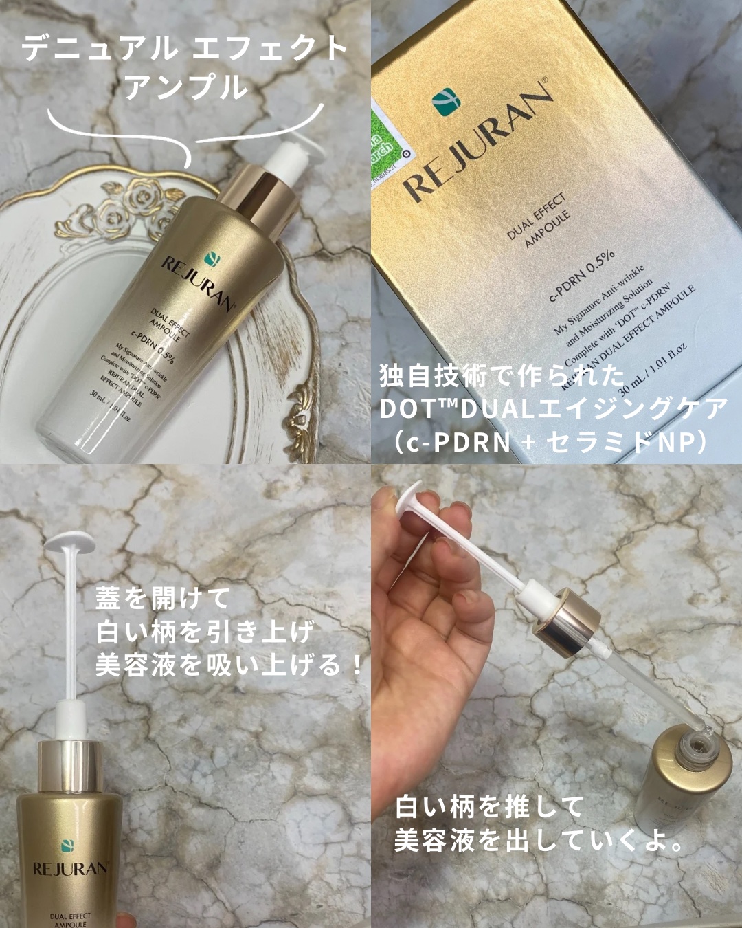 .REJURAN(@rejuran_jp_official)DUALEFFECTAMPOULEスローエイジング(※1)万能美容液!高級感のあるゴールドのパッケージで使うたびに贅沢な気分になれる。とろりとした半透明の美容液で肌に馴染ませるとしっ...