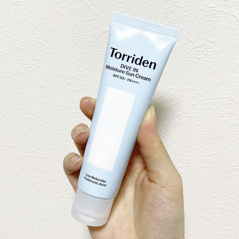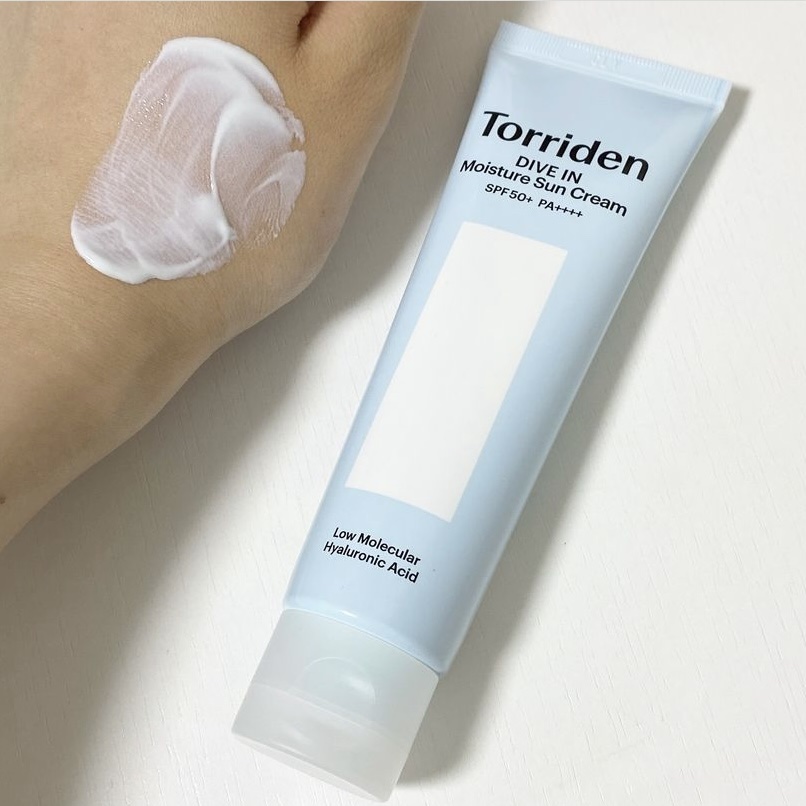 Torriden ダイブインウォータリーモイスチャーサンクリーム。無香料です。日焼け止め特有の香りは全然ありません。淡い水色でテクスチャーは程よく柔らかさがありなめらかで軽いクリームです。日焼け止め特有のキシキシ感が全然なくとても伸びがよくて...