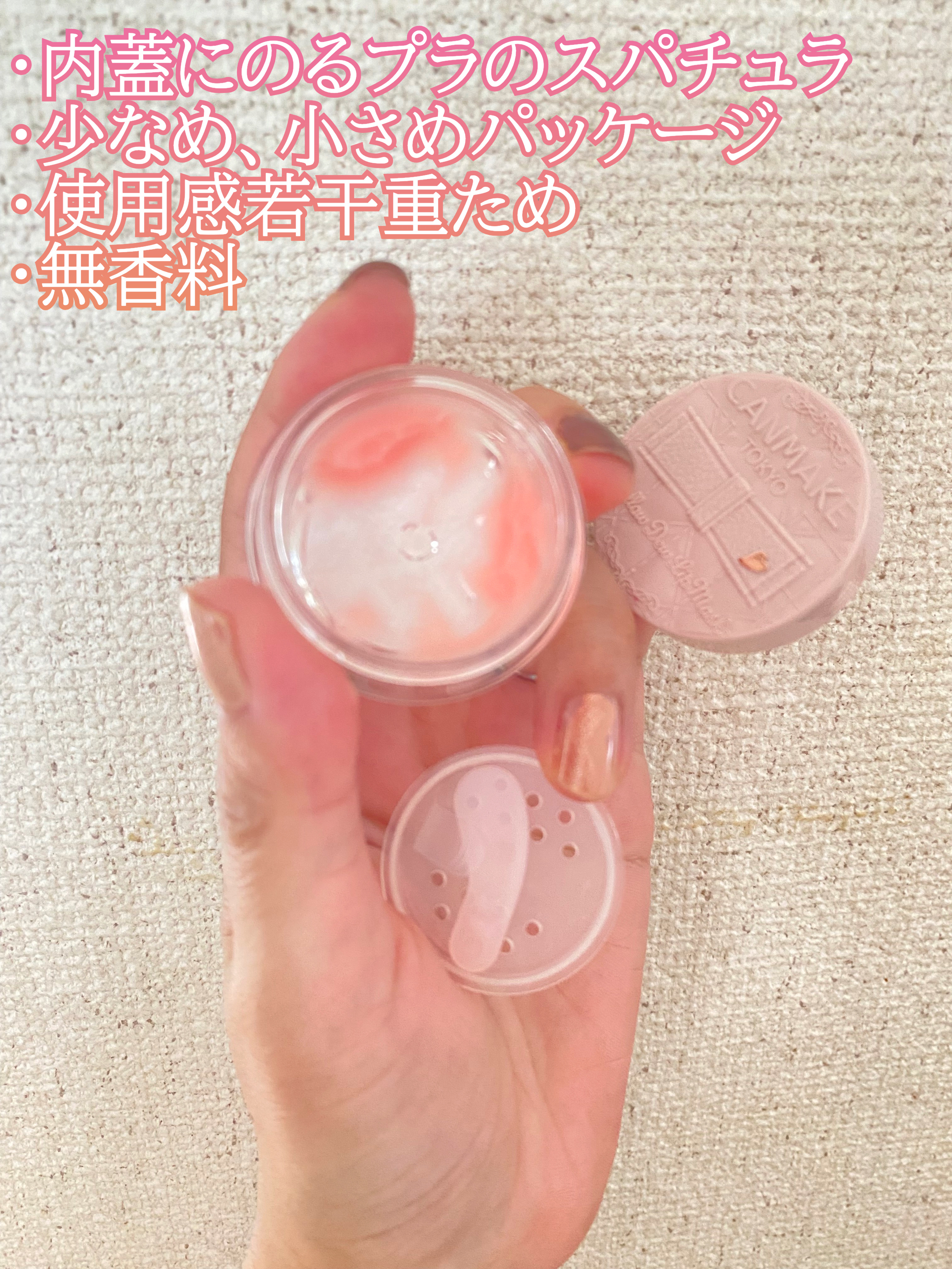 フタを開けると中蓋の上にスパチュラが…!まさかこのサイズでスパチュラ入りとは思ってなかったから嬉しい。 テクスチャーは柔らかくて、正にとろけるような使用感。唇がぷるっぷるになるし翌朝までちゃんとしっとりしてる。 全体的な使用感として私はCANMAKE派でした🌸価格は792円。使用感最高だし容器も使いやすく設計されていてこの価格は流石CANMAKE。
