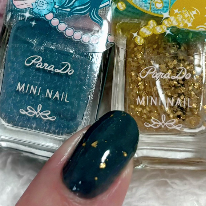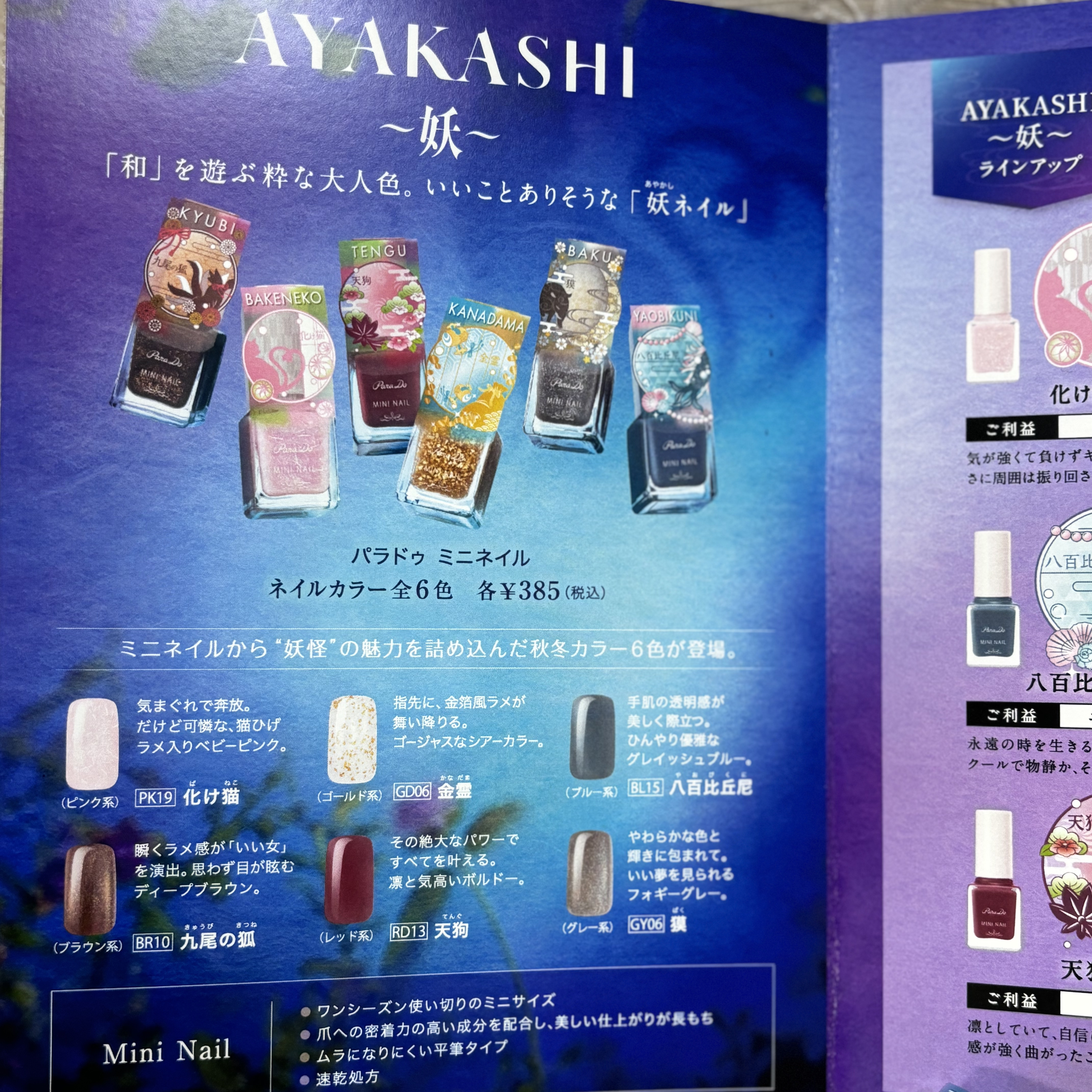 パラドゥミニネイル2024秋冬新色 オンライン発表会に参加させて頂き2024年秋冬カラーも送って頂きました。 今回のミニネイルテーマはAYAKASHI ~妖~輪を遊ぶ粋な大人色。いいことありそうな「妖(あやかし)ネイル」 化け猫は透明感あるミルキーピンクに細長いグリッターが入っているテクスチャーで、金霊は金箔をちぎって入れたようなゴールドのグリッターが入ったクリアゴールドで