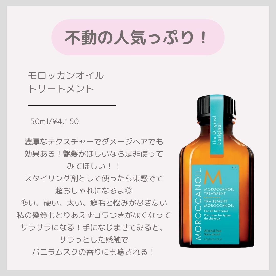 いい香りすぎてほぼ香水 ・emma emu エンカンタールヘアオイル 100ml/¥3,080 1日中キープしてくれる ・N.(エヌドット)ポリッシュオイル 150ml/¥3,400 不動の人気っぷり ・モロッカンオイル トリートメント 50ml/¥4,150