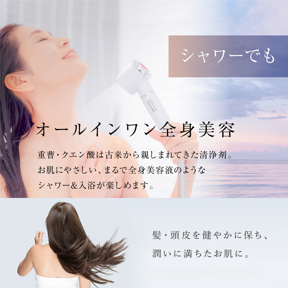 こちらのホットタブはシャワーヘッドにセットして使用することが出来るだけでなく、入浴剤としても使用できます🌟 ホットタブの成分(ビタミンC)が水道水の残留塩素を中和し、滑らかな肌触りへと導きます!まるで美容液を浴びるようなシャワー‼️ 髪のキシキシ感がなくなり、肌は潤いすべすべになりました。また、入浴剤としても使用してみて体の芯から温まるのを感じました!