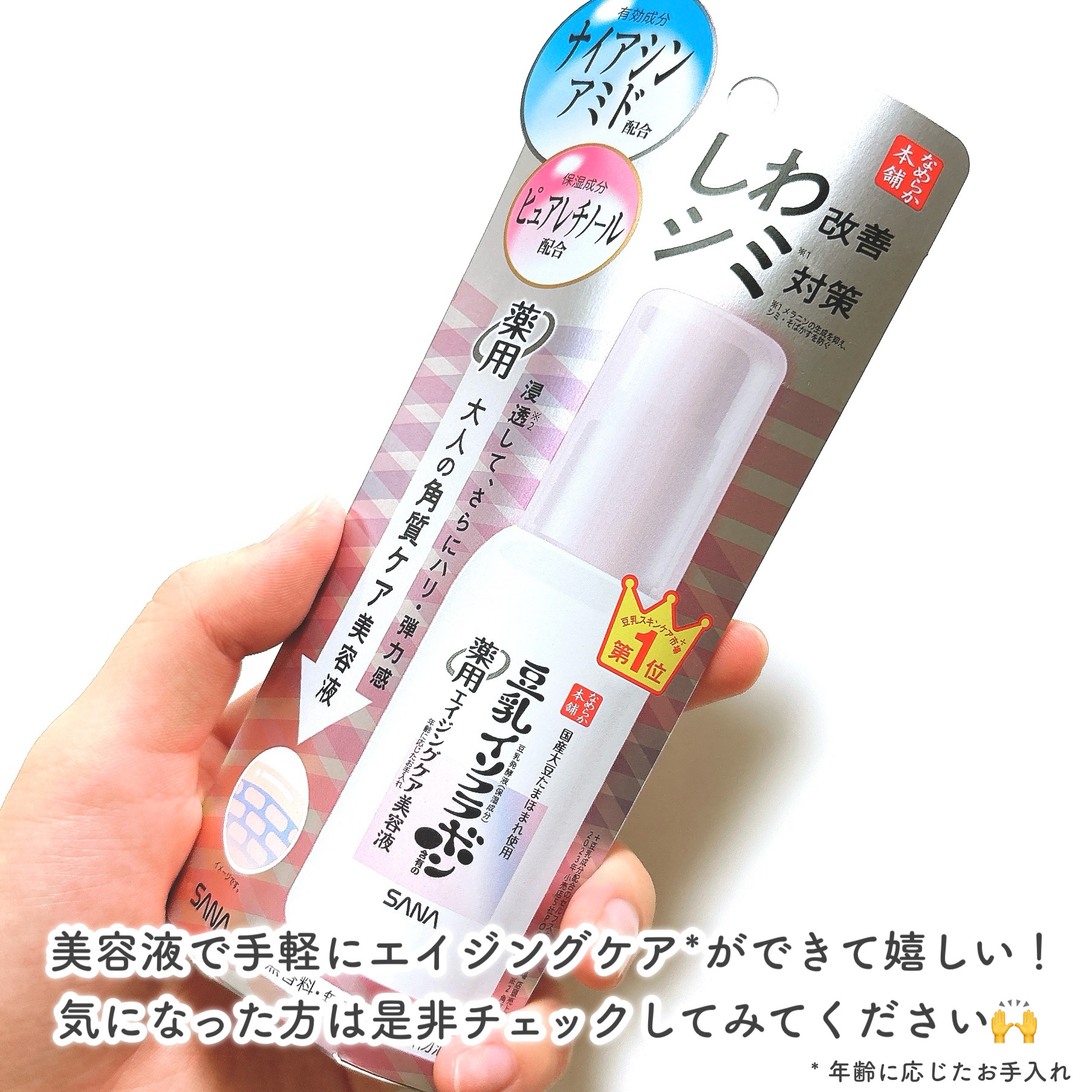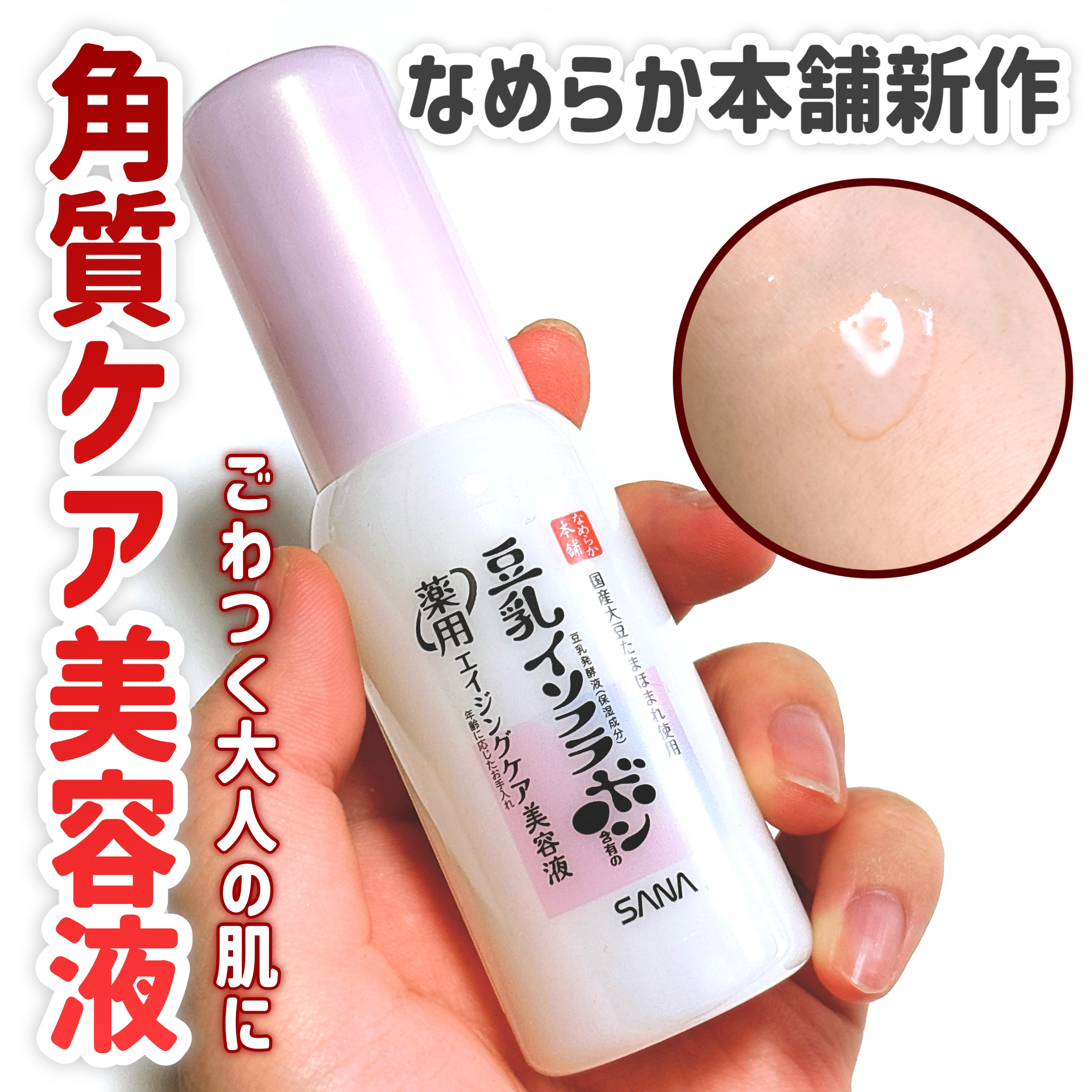 - 【医薬部外品】 浸透*1して、ハリ・弾力感 大人の角質ケア美容液 無香料・無着色・無鉱物油 豆乳発酵液含有の薬用エイジングケア*2美容液 しわ改善&シミ対策できる豆乳の角質ケア美容液 シミ対策:メラニンの生成を抑え、シミ・そばかすを防ぐ 有効成分ナイアシンアミドがお肌の奥まで届く! 角質にアプローチしながら、ハリ・透明感のある素肌へ。 乾燥が気になる大人のお肌に 乳酸(保湿成分):うるおいで角層をやわらかくなめらかに整えます。 豆乳発酵液(保湿成分):弾力感・うるおいを与え、ふっくらとした質感のお肌に。 ピュアレチノール(保湿成分):ビタミンAの一種で、ハリのあるお肌に。 ナイアシンアミド(有効成分):しわを改善し、メラニンの生成を抑え、シミ・そばかすを防ぎます。 ごわつきが気になるときに・・・コットン使い! 洗顔後、化粧水の前にコットンに適量(3プッシュ程度)をとり、お顔全体にやさしくくるくると広げてなじませてください。 つるんとハリ・透明感! 国産丸大豆「たまほまれ」使用 なめらか本舗「エイジングケアライン」オリジナルの豆乳発酵液(保湿成分)は、国内で栽培された大豆「たまほまれ」を丸ごと使用して作られています。 なめらか濃縮製法でつくるオリジナルの豆乳発酵液 豆乳発酵液に使用している大豆は、遺伝子組換えなし大豆を使用しています。 ●パッチテスト済み ●アレルギーテスト済み (すべての方に皮フ刺激やアレルギーが起きないわけではありません。) *1角層まで *2年齢に応じたお手入れ