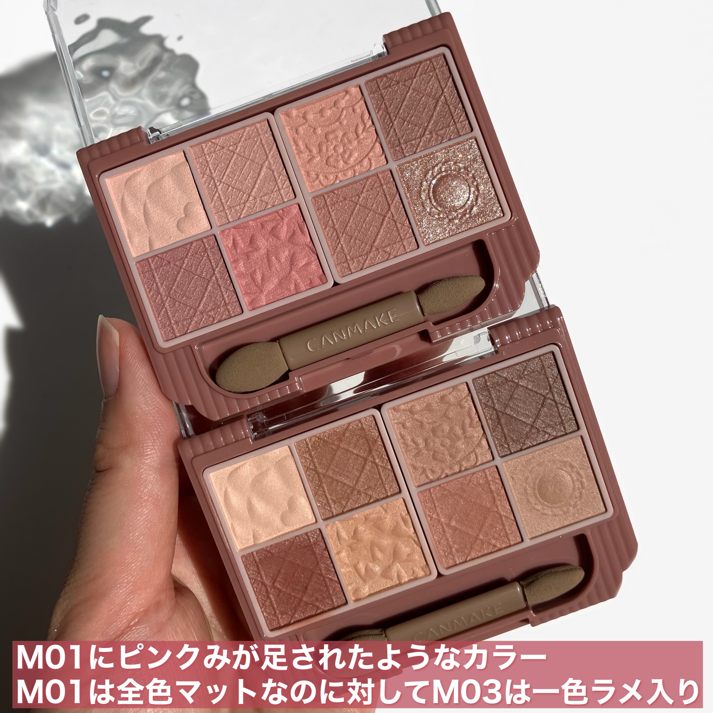 - いつでも一緒♡多色なのに持ち歩ける! 8色入りアイシャドウパレットのマットタイプ♪ 多色パレットでありながら、「持ち歩けること」と「外出先でもメイク直しができること」にこだわったアイシャドウパレット。 ダブルエンドチップ付です♪ マットが大好きな方にも、少し苦手意識がある方にも手に取っていただきたく全色マットor1色ラメ入りの構成にしています♪ (M01:全色マット、M02・M03:1色ラメ入り) 全体は同系色で統一しており、全色使いやすいパレット。 色の組み合わせは自由に♡自分好みのメイクを楽しめます! 【マット】 隠ぺい感とふわっと感を両立させた質感♪ なめらかで重ねても粉っぽくなりにくく、厚塗り感のない仕上がり。 伸びが良いのでムラになりにくく、しっとりフィットして仕上がりを長時間キープ✨ 【ラメ】 ラメ・パールだけがのる透明感のある仕上がり。 高輝度なガラスパール配合で、高見えする輝き✨ なめらかで粉っぽくならず、しっとり密着して仕上がりを長時間キープ! サラサラしたマットシャドウにもラメがしっかり密着する処方を追求しました♪ 蓋にはマット感を表現したすりガラス風のグラデーションデザインが、パウダー部分にはリボンやレース・ボタンの型押しが入っているなど、デザインにもこだわっています♡