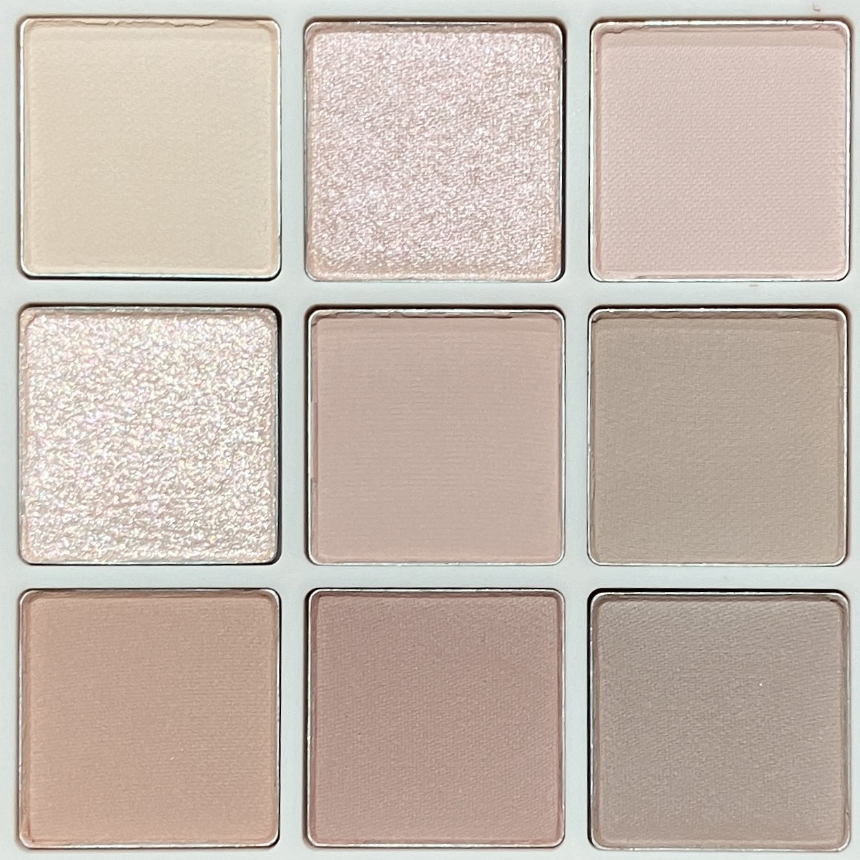 ミュートなローズやピンクベージュが多めの配色で、濃い締め色はない。締め色いらない人におすすめ。 左上の薄いマットカラーもちゃんと発色してくれる。下段はパレットの見た目よりも柔らかい色に発色するので、メインカラーとして使える。 ちょうどいい発色・柔らかい質感のマットカラー・色かわいい🤤・締め色もラメもあんまり使わないわたしにぴったり