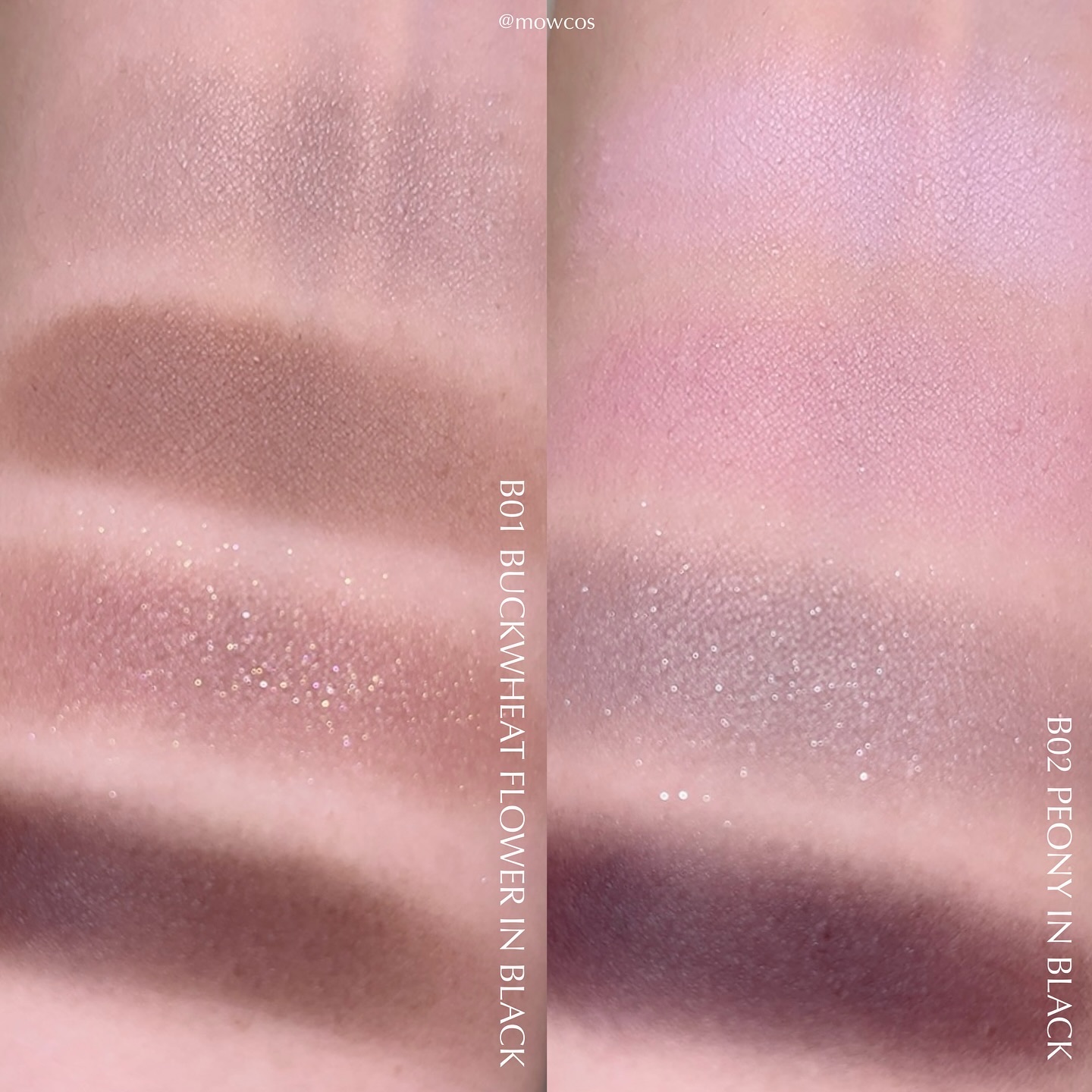 見た目よりも肌にのせるとめちゃくちゃキラキラ✨ たっぷり細かいラメが入っていて可愛すぎる🥹💕 水分量で色が少し変わってピンクみも増す! うるおい感たっぷりのブラックグレープピンクカラー🍇 イナピスクエア限定コラボパッケージで登場✨️ 特にベターザンアイズのB01バックウィートフラワーインブラックはめちゃくちゃ好み😍😍😍