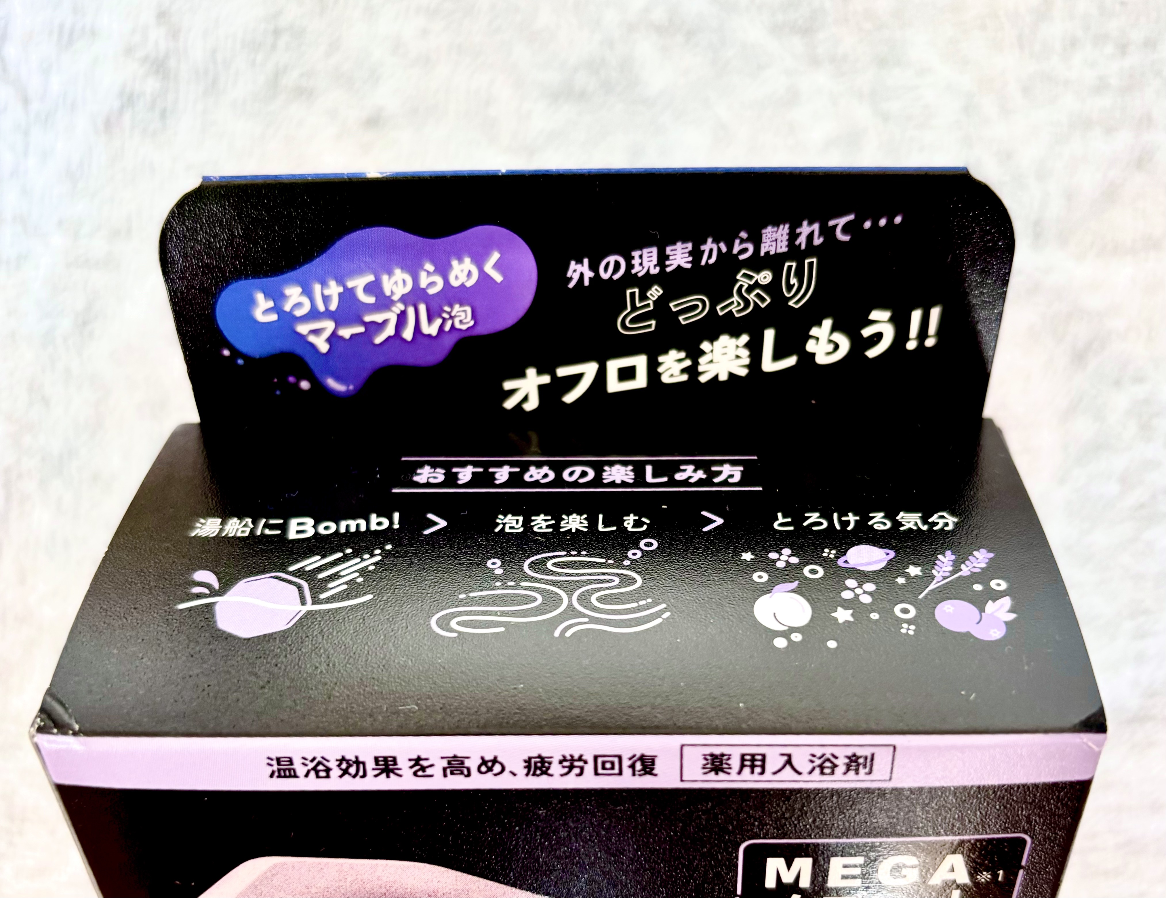 パケが目を惹き、オフロが楽しくなりそうな予感🤭💜 ずっしりと大きなタブレットを湯船にBombと入れると炭酸がはじけシュワシュワ〜っとマーブル泡が🫧 炭酸量MAX*²だそうで温浴効果も高く疲労回復も期待できるそう👍✨ 泡も楽しめるし、ラベンダーカクテルの香りも良く、お湯の色もスペースバイオレット(色つき透明)と薄い紫色が幻想的でホッととろけるような気分になり心地良い😌💜