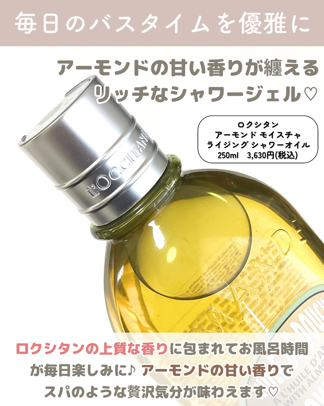 #PR#ロクシタン商品名:ロクシタンアーモンドモイスチャライジングシャワーオイル容量/価格:250mLオイルでなで洗いするという、これまでにない新感覚のシャワーオイル。アーモンド*の美肌成分たっぷりで、「洗う」「うるおい感のある洗い上がり」「...