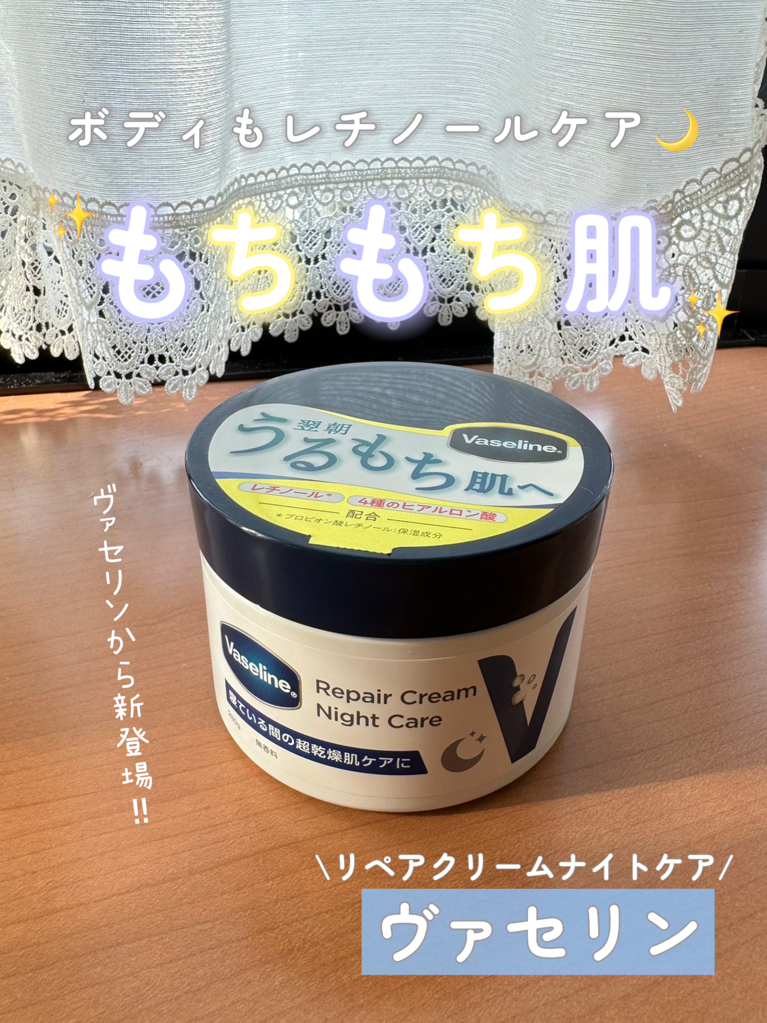 話題のレチノールや4種のヒアルロン酸を配合したヴァセリンの夜用ボディクリーム♡ 超乾燥肌も夜の間にうるおして、うるもち肌へ導いてくれるんだって♪ 肌あたりはしっとりしつつもベタつかない。太ももの内側もペタペタしないのも良い〜!