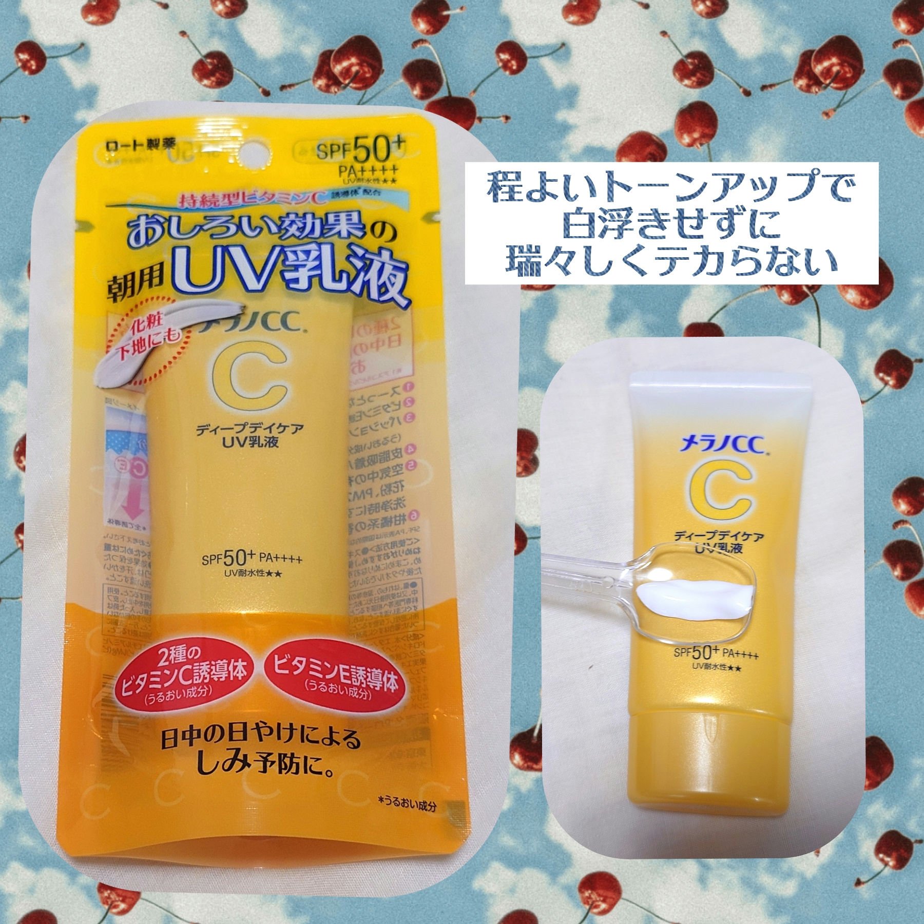 メラノCCディープケア乳液〈日焼け止めミルク〉 SPF50+・PA++++UV耐水性☆☆持続型ビタミンC誘導体(うるおい成分)配合で日中の日焼けによるしみを予防パッと明るく見せる仕上がりで化粧下地としても使えますが顔が敏感なときがあるので私は...
