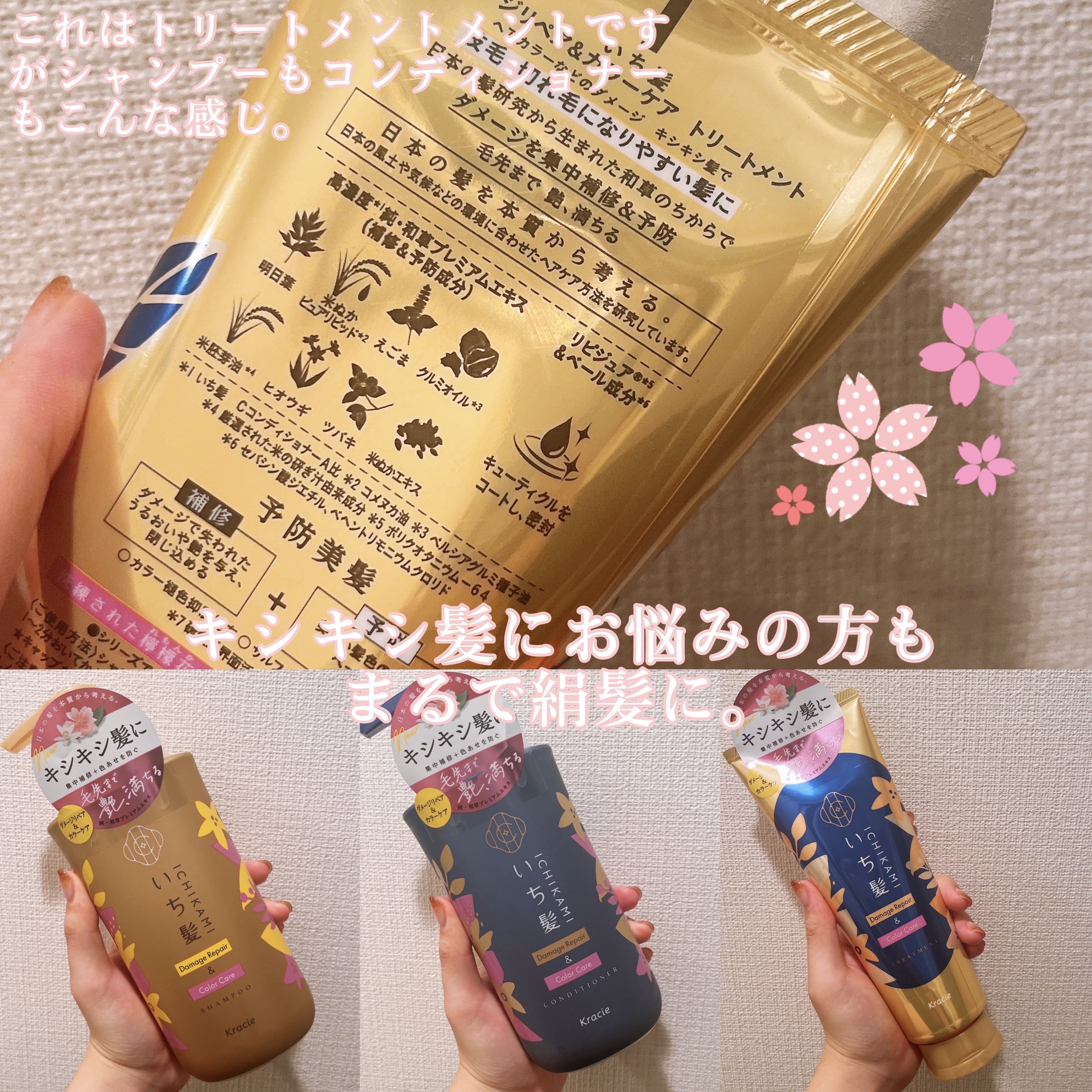 いち髪ダメージリペア&カラーケアシャンプー/コンディショナートリートメントダメージを集中補修+色あせを防ぐ予防美髪ケアシリーズ●ヘアカラーなどのダメージによる”キシキシ髪”のために。毛先まで艶、満ちる。●補修&予防成分「純・和草プレミアムエキ...