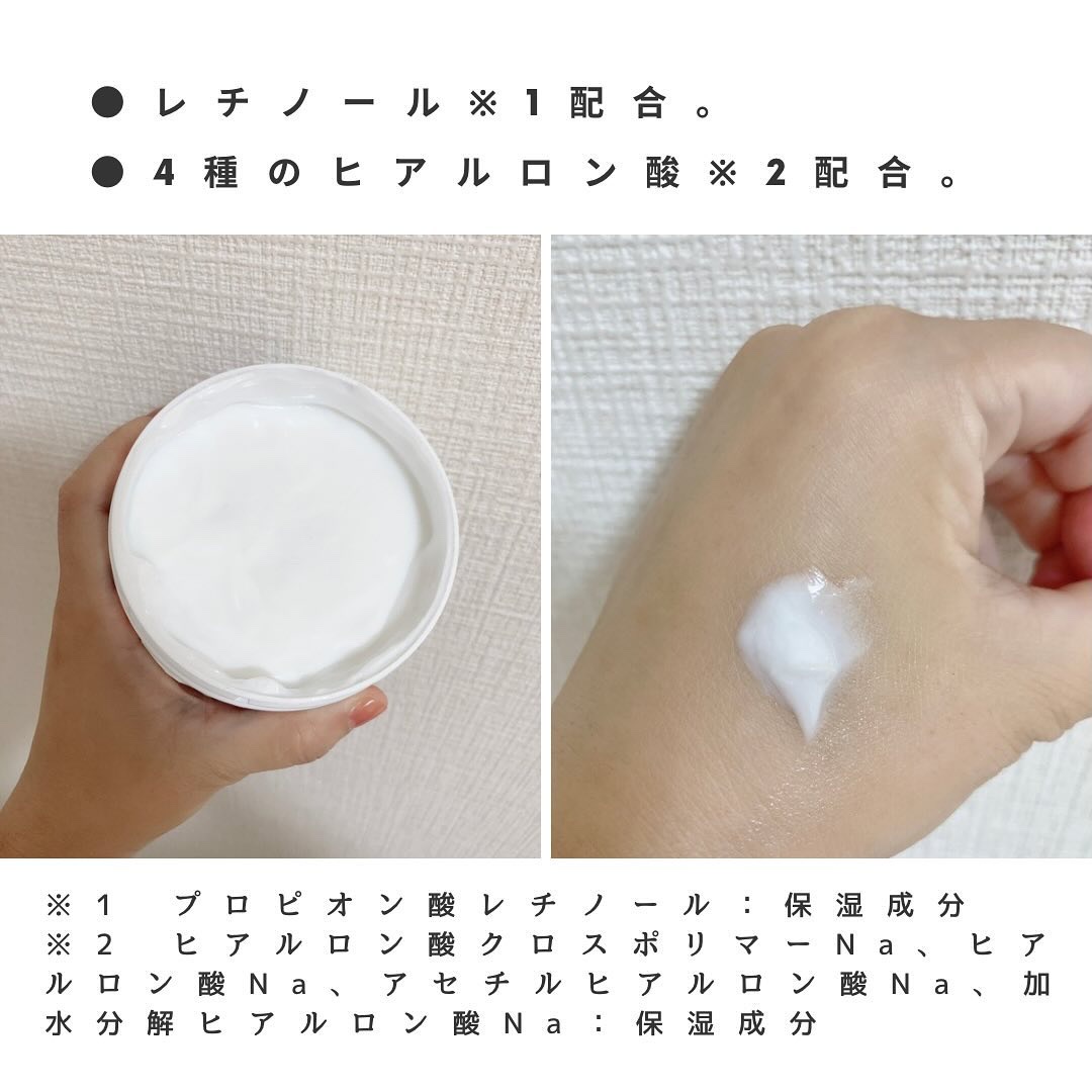 - 全身「夜レチ」クリーム。 レチノール*1・4種のヒアルロン酸配合*2のナイトケア用ボディクリーム。 肌の”ゴールデンタイム”に向けたおやすみ前のケアで、翌朝まで”うるもち肌”が続きます。 うるおいしっかりなのにべたつかずスーっと肌になじむので、ボディクリームが苦手な方にも。 普通肌~乾燥肌・超乾燥肌の方に。無香料。 *1 プロピオン酸レチノール:保湿成分 *2 ヒアルロン酸クロスポリマーNa、ヒアルロン酸Na、アセチルヒアルロン酸Na、加水分解ヒアルロン酸Na:保湿成分