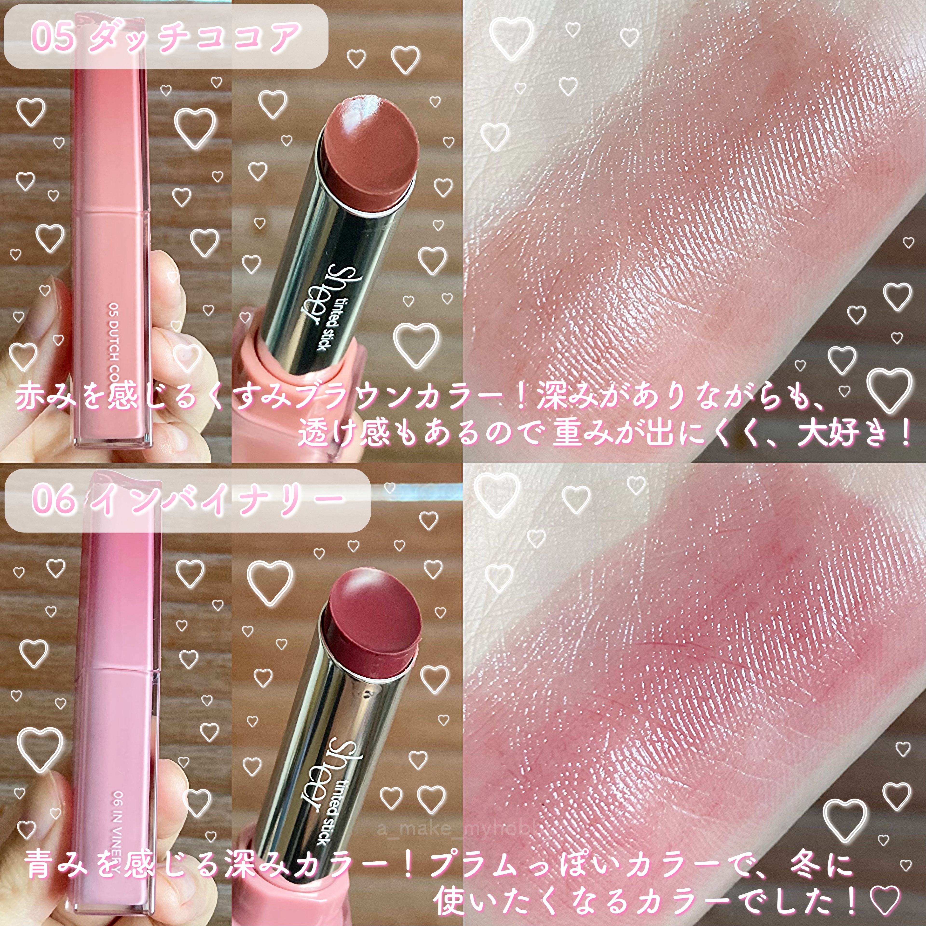 透け感のあるテクスチャーはバームのようなベタつきはなく、サラッと使えるんです☝️✨ ぷるぷるゼリーみたいなカラーのかわいいパケはスリムで持ち歩きにぴったり。 全体的にシアーで柔らかい仕上がりなので普段使いしやすいですし、持ち歩いてお直しリップとしても良さそう✨