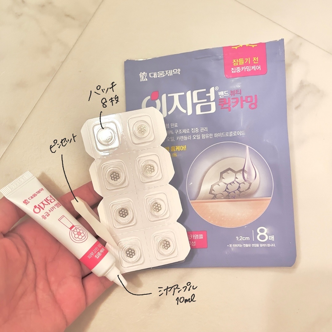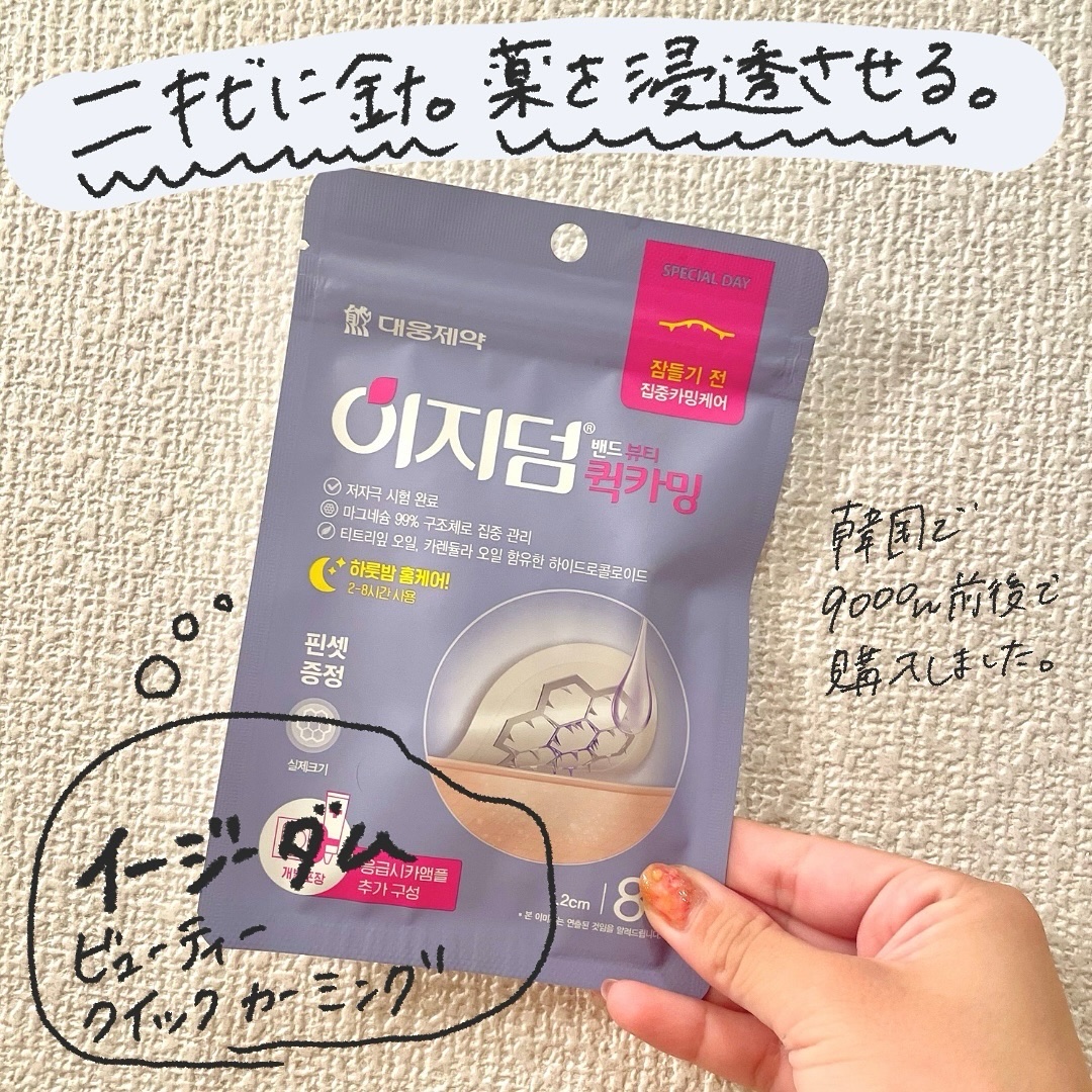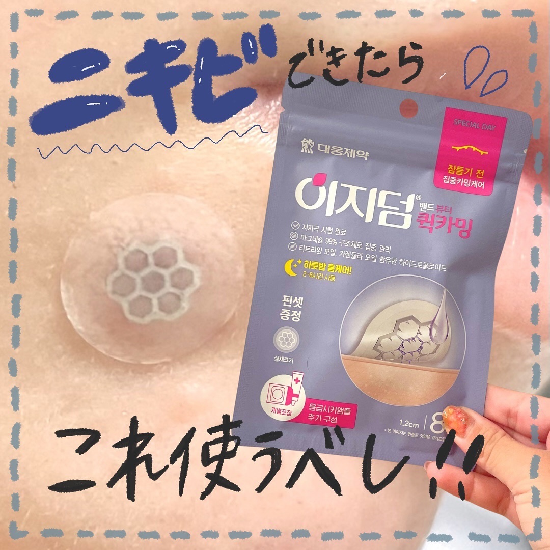 韓国の大手製薬会社『大熊製薬』が開発した話題のニキビパッチ! ニキビの状態に合わせて4種類から選べます。 クイックカーミング(紫)×リアルカーミング(ピンク) 1日で素早くニキビを鎮静させたい時におすすめな組み合わせ! 朝パッチを剥がした時には赤みが引いて ニキビが気にならないくらいまで落ち着いた◎