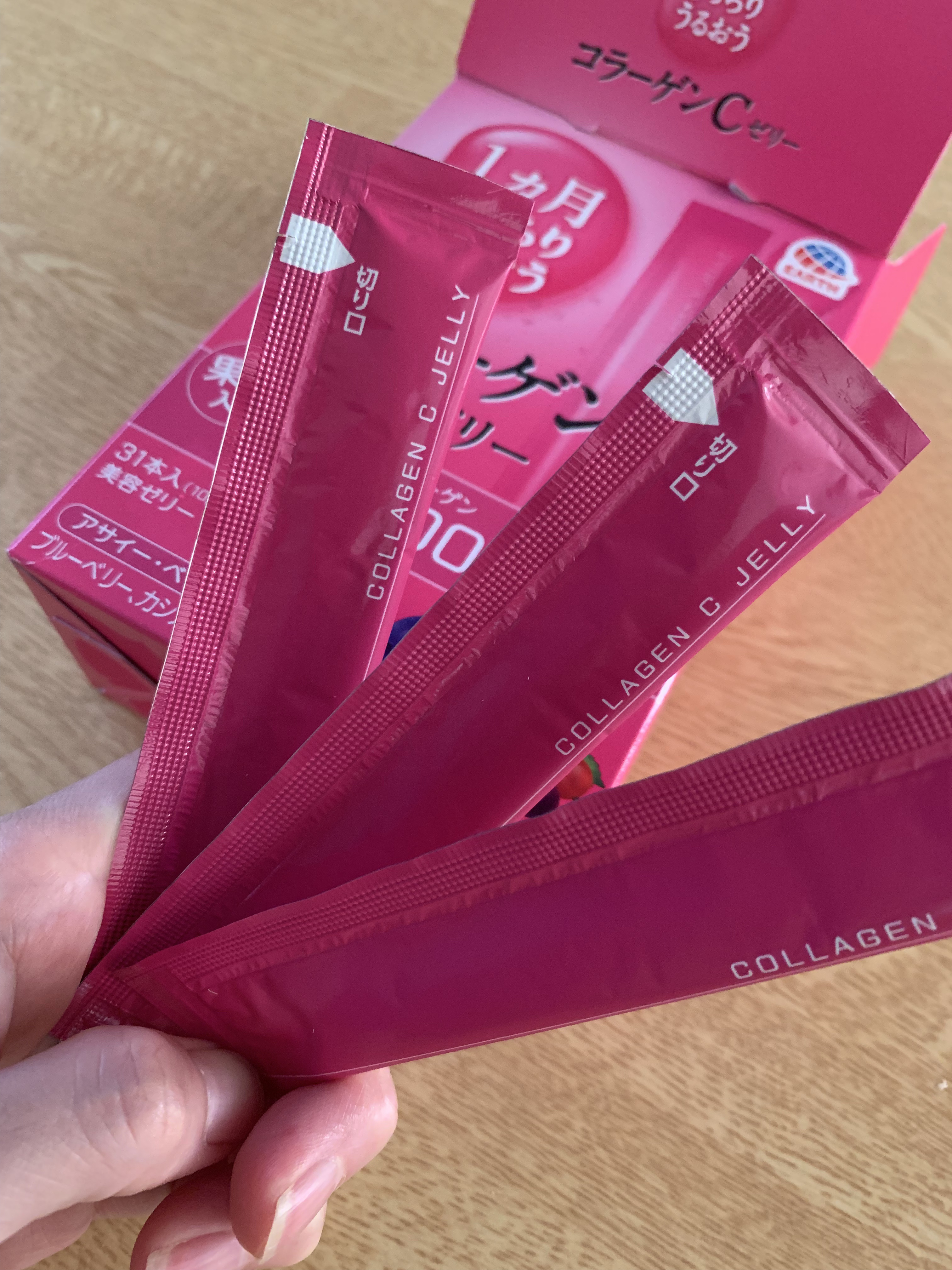 アサイーベリー味のゼリーです。コラーゲンとビタミンCが取れるので良いです🙆♀️ もっちりしたしっかりめの食感で、味も食感も個人的には好きなほうです。 1ヶ月分、Amazonで2000円しないくらいで購入。