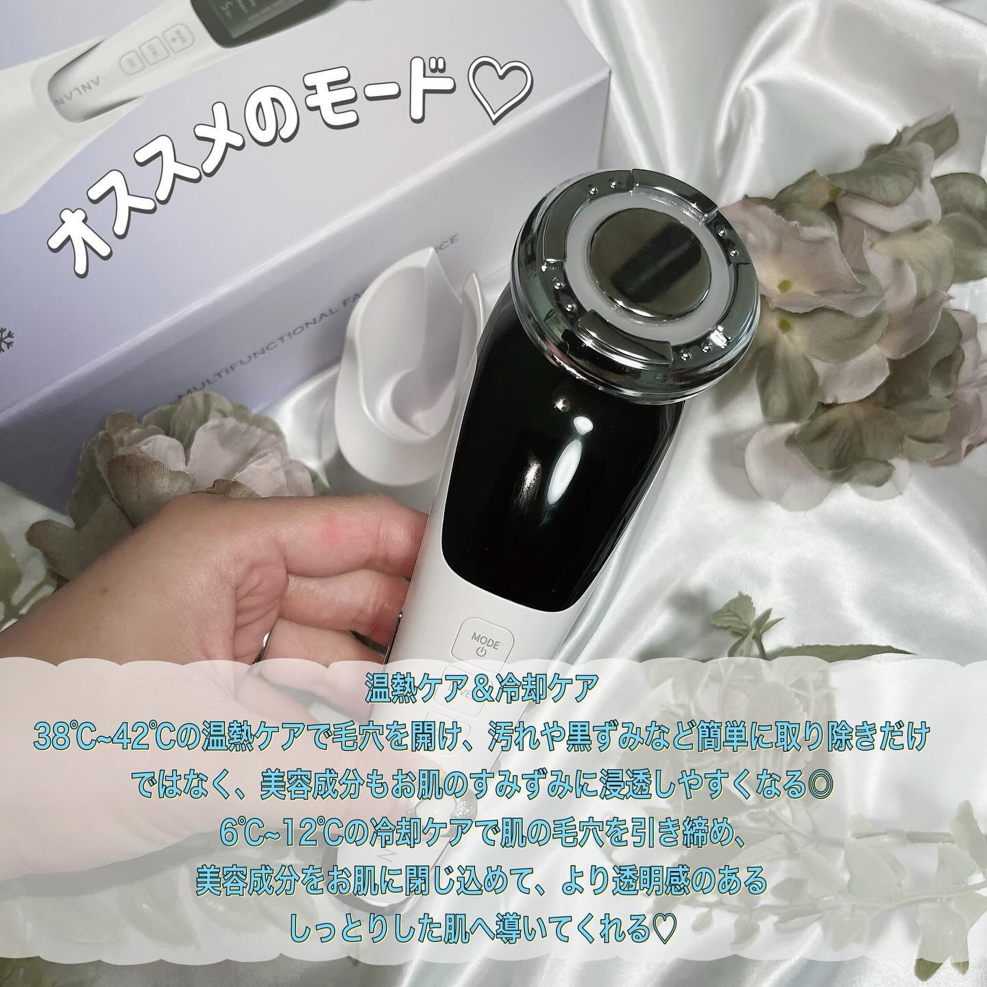 ANLAN温冷美顔器美人百花に掲載されて沢山の雑誌・メデイア・SNSでも話題の美顔器を使ってみました♡(1)Cleanモード→汚れを除去(2)EMSLifitingモード→EMSリフト(3)Moisturizingモード→美容液を浸透(4)C...